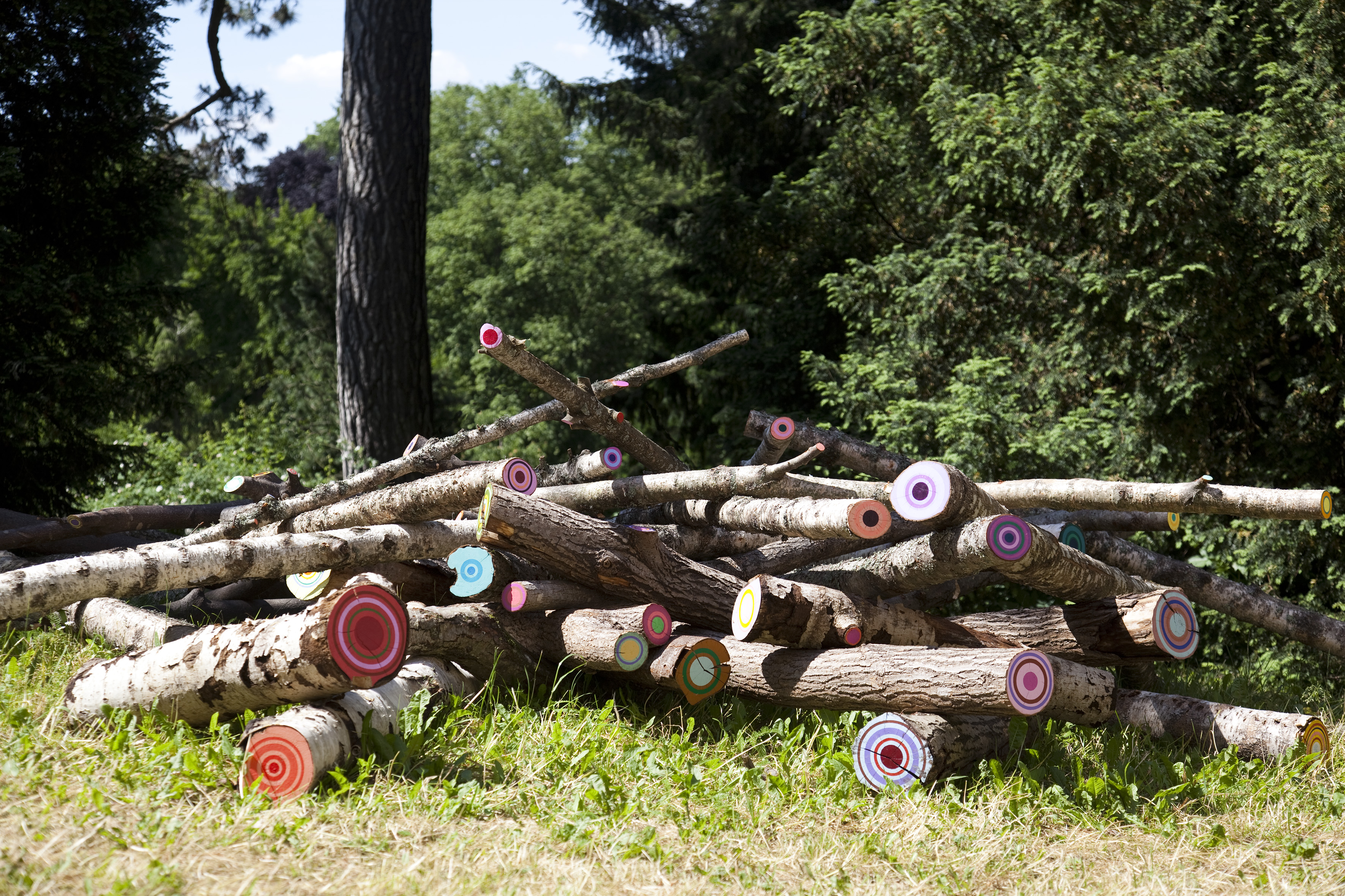 Seit dem Abschluss ihres Studiums an der Königlichen Hochschule für Bildende Künste in Stockholm im Jahr 2000 arbeitet My Ekman bevorzugt mit ortsspezifischen Installationen im öffentlichen Raum und mit Druckgrafik in verschiedenen Auflagen. Dadurch möchte sie ihre Werke für die Allgemeinheit zugänglich machen: Sie sollen zur Alltagserfahrung möglichst vieler Menschen gehören und Teil gesellschaftlicher Prozesse sein. Ekman hat in Schweden zahlreiche öffentliche Aufträge ausgeführt, gleichzeitig jedoch an Ausstellungen im ganzen Land teilgenommen. Das zentrale Element in ihrem künstlerischen Schaffen ist die Farbe und deren Verwendung, um Stimmungen auszudrücken und zu steigern. So kombiniert Ekman in ihrer abstrakten Grafikserie „Life Circles“ variantenreich bunte konzentrische Kreise, denen nur der Titel einen Bedeutungsrahmen verleiht. Eine Veranschaulichung erfahren diese ‚Lebenskreise‘ in der für Blickachsen 12 geschaffenen Arbeit „Annual Rings“ – eine Installation zahlreicher lose aufeinanderliegender Holzstämme, deren Schnittflächen mit Farbkreisen bemalt sind, die sichtlich ‚Jahresringe‘ andeuten und ein buntes Innenleben der Bäume suggerieren. So wird der grüne Aufstellungsort auf humorvolle Weise durch ein farbenfrohes Detail kommentiert und ergänzt.