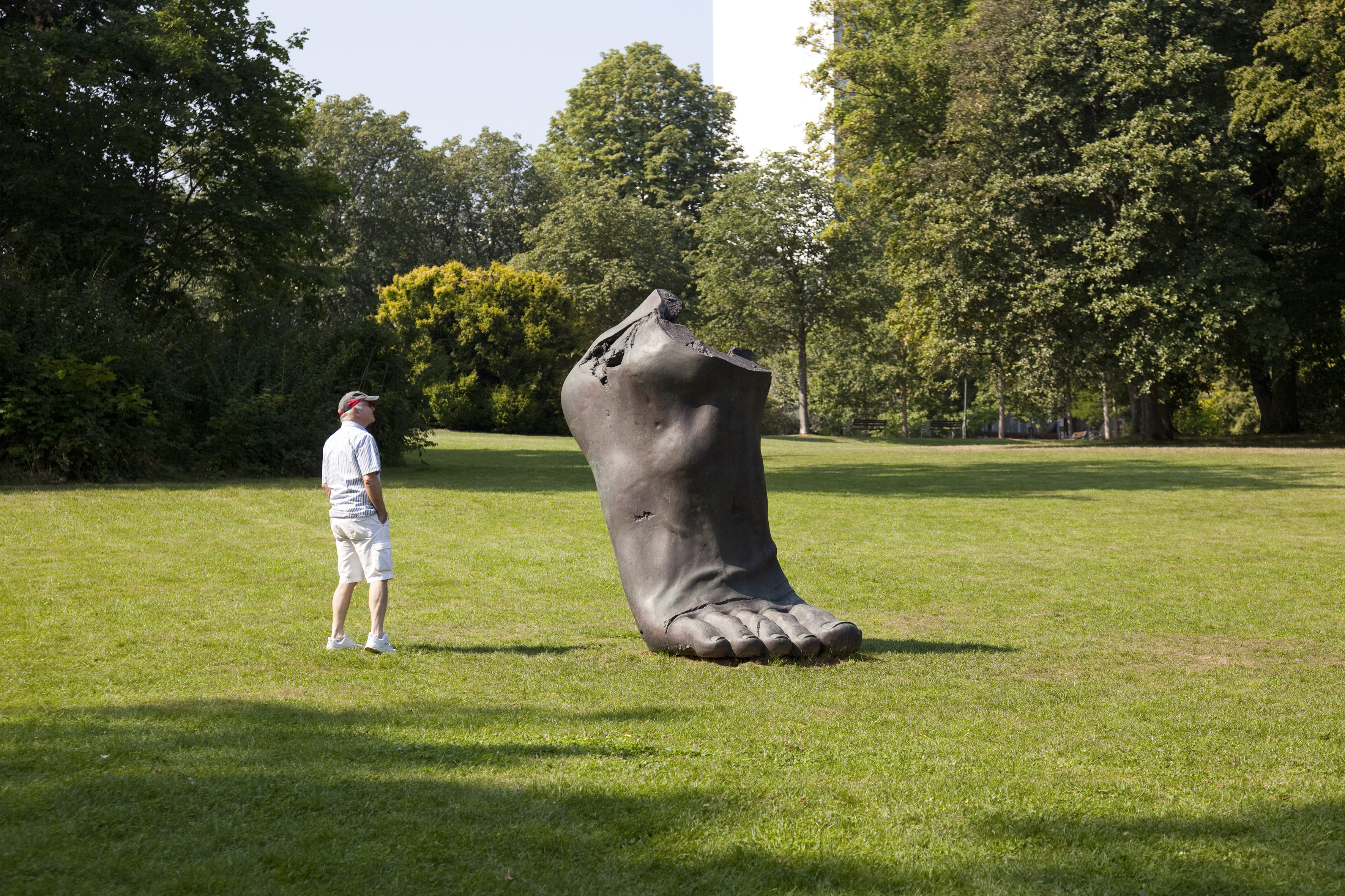 Fredrik Wretman stellte seine Skulpturen bereits europaweit aus und ist vor allem in Schweden in zahlreichen Sammlungen vertreten. Der Künstler lebt und arbeitet in Schweden und Thailand und verarbeitet in seinen Skulpturen häufig Versatzstücke aus verschiedenen Kulturen, Mythologien und Religionen. Wiederkehrende Figuren sind der Götterbote Hermes, der in sein Spiegelbild verliebte Narziss oder auch Buddha. Wretmans zentrales Anliegen ist dabei immer, die Betrachter zu eigenen Überlegungen und Assoziationen anzuregen, und so sind seine Werke – im Spannungsfeld zwischen Ernst und Spaß – offen in ihrer Bedeutung. Ein Interesse für die Antike spiegelt sich auch in seiner Arbeitsweise: Er verwendet Gusstechniken mit verlorener Form, wie etwa das Wachsausschmelzverfahren, dessen Prinzip bereits seit Jahrtausenden bekannt ist. Die im Kurpark platzierte Bronze mit dem Titel „Big Half Foot“, ein skalierter Abguss des Fußes des Künstlers selbst, ermöglicht eine weitere Assoziation mit der Antike, erinnert sie doch an ein Fragment einer Skulptur, vielleicht den leicht angehobenen Fuß eines im Kontrapost stehenden Kolosses. Während die meisten heute erhaltenen antiken Skulpturen Kopien von Bronzen in Stein sind, wird hier die Bruchkante einer Steinskulptur in Bronze imitiert.