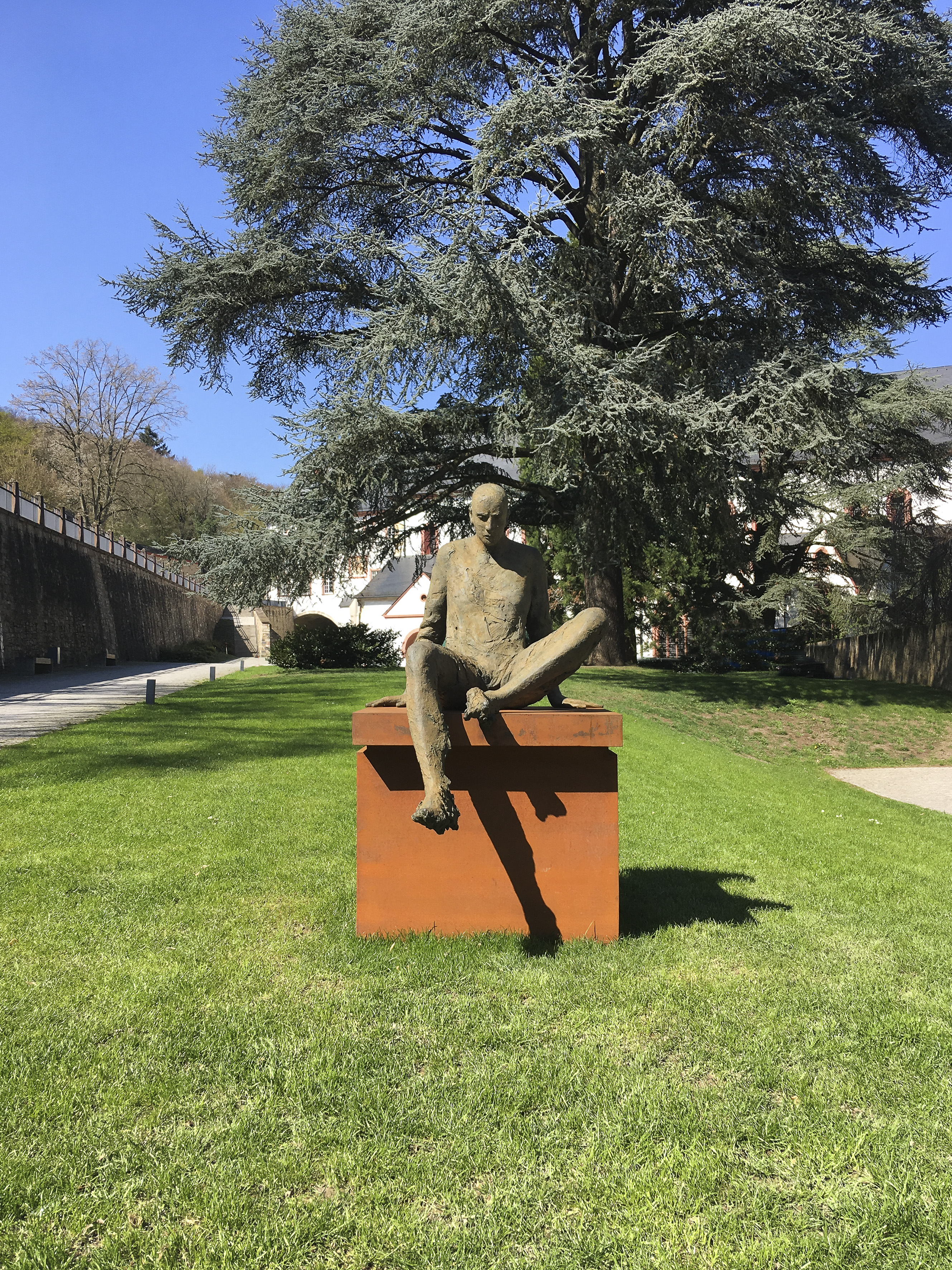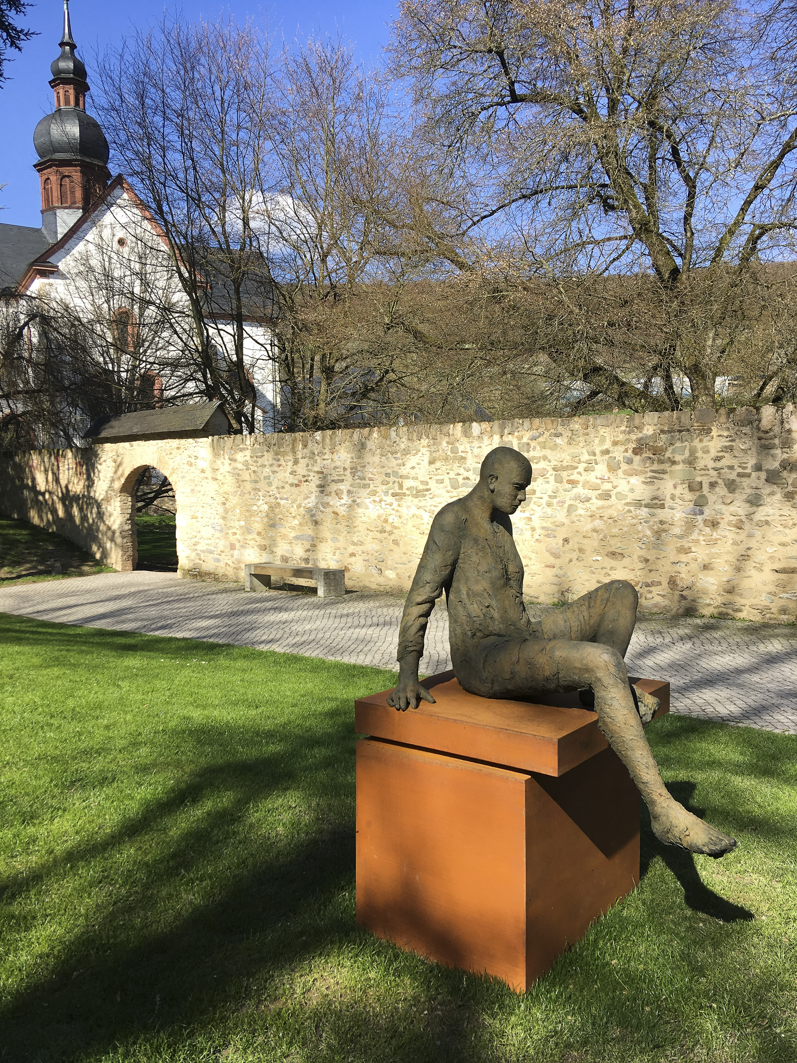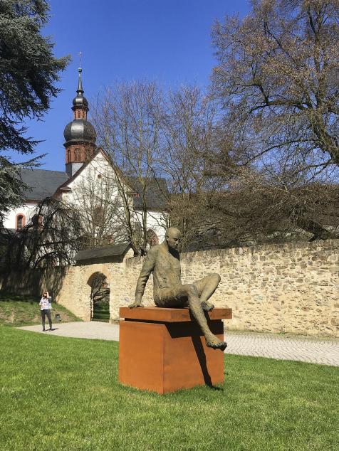 Seit dem Studium der Bildhauerei beschäftigt sich Hanneke Beaumont mit der menschlichen Figur. Die Monumentalskulptur „Stepping Forward“ vor dem Europagebäude in Brüssel hat die Kunstwelt in Europa, Asien und den USA auf ihre Arbeiten aufmerksam gemacht. Meist präsentiert Beaumont ihre überlebensgroßen Figuren aus Terrakotta, Eisen oder Bronze in unangestrengten und nicht-klassischen Posen auf rechtwinkligen Sockeln und Podesten. So auch ihre dauerhaft in Bad Homburg installierte Gruppe „Melancholia I“. Bei Blickachsen 12 bietet der konzentrierte, ruhige Rahmen des Klosters Eberbach der fokussierten Stimmung der neun ausgestellten Bronzeskulpturen einen idealen Rahmen. Balancierend, sitzend oder kniend scheinen die Figuren in ihrer Bewegung innezuhalten. Sind die Körper auch klar definiert, bleiben die Oberflächen schrundig und vage. Sie sind von einfachen Gewändern bedeckt, ohne dass man die Kleidung benennen könnte. Genauso unbestimmt wirken die deutlich modellierten Gesichter, die keine Individualität und keinen Ausdruck zeigen. Beaumont schafft es, durch universale Körperhaltungen individuelle Stimmungen auszudrücken. Dabei thematisiert sie nicht nur das Mensch-Sein. Weil sie die menschlichen Figuren auf Sockeln platziert, interpretiert sie auch die klassische Idee von Skulptur neu.