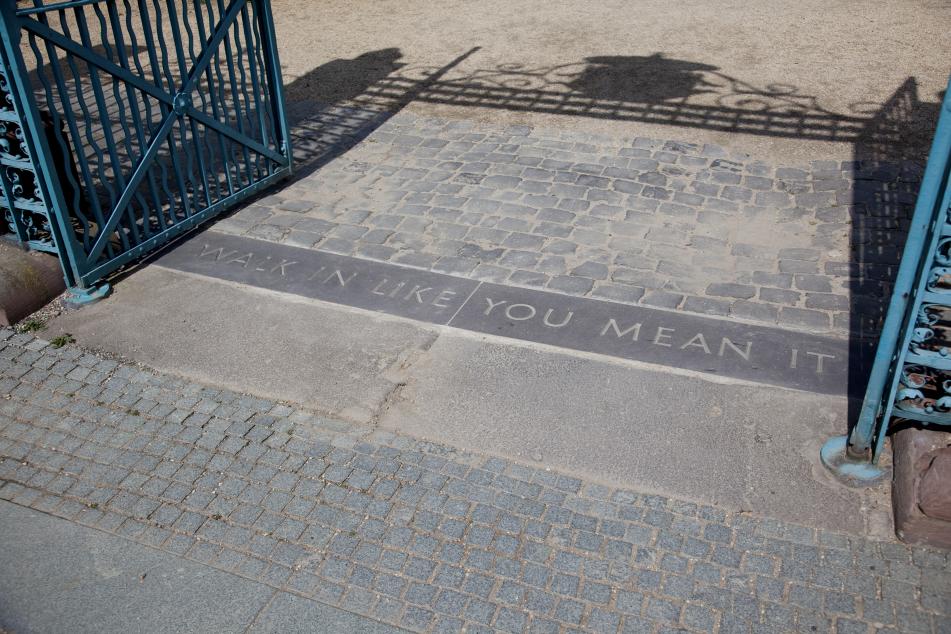 William Forsythe hat sich von 1984 bis 2004 internationale Anerkennung als künstlerischer Leiter des Frankfurter Balletts verschafft und seine Arbeit als Choreograph bis 2015 mit der Forsythe-Company fortgesetzt. Er gilt als einer der kreativsten zeitgenössischen Erneuerer des Balletts. Seit den 1990er Jahren entwirft Forsythe raumbezogene Installationen, die er „Choreographische Objekte“ nennt und weltweit in den bedeutendsten Museen zeigt. Bereits 2010 erhielt er auf der Biennale in Venedig den Goldenen Löwen für sein Lebenswerk. Für Blickachsen 12 hat Forsythe zwei ortsspezifische Installationen angefertigt, deren Erstfassungen 2018 im Antwerpener Middelheimmuseum ausgestellt waren. Sie machen den Besucher selbst zum Akteur und regen ihn dazu an, die physische Selbstwahrnehmung zu schärfen. Für „Backwards” hat Forsythe in die Rückensprossen einer nachgebauten Bad Homburger Parkbank eine Handlungsanweisung graviert: „Walk nineteen steps away from the bench. With your eyes closed, walk backwards and sit down.“ Für “Debut” wurden die Bodensteine am Eingangstor des Schlossparks durch Steine gleichen Materials ersetzt, auf denen „Walk in like you mean it“ zu lesen ist: Besucher werden aufgefordert, entschlossenen Schrittes einzutreten – wie bei einem Bühnenauftritt.