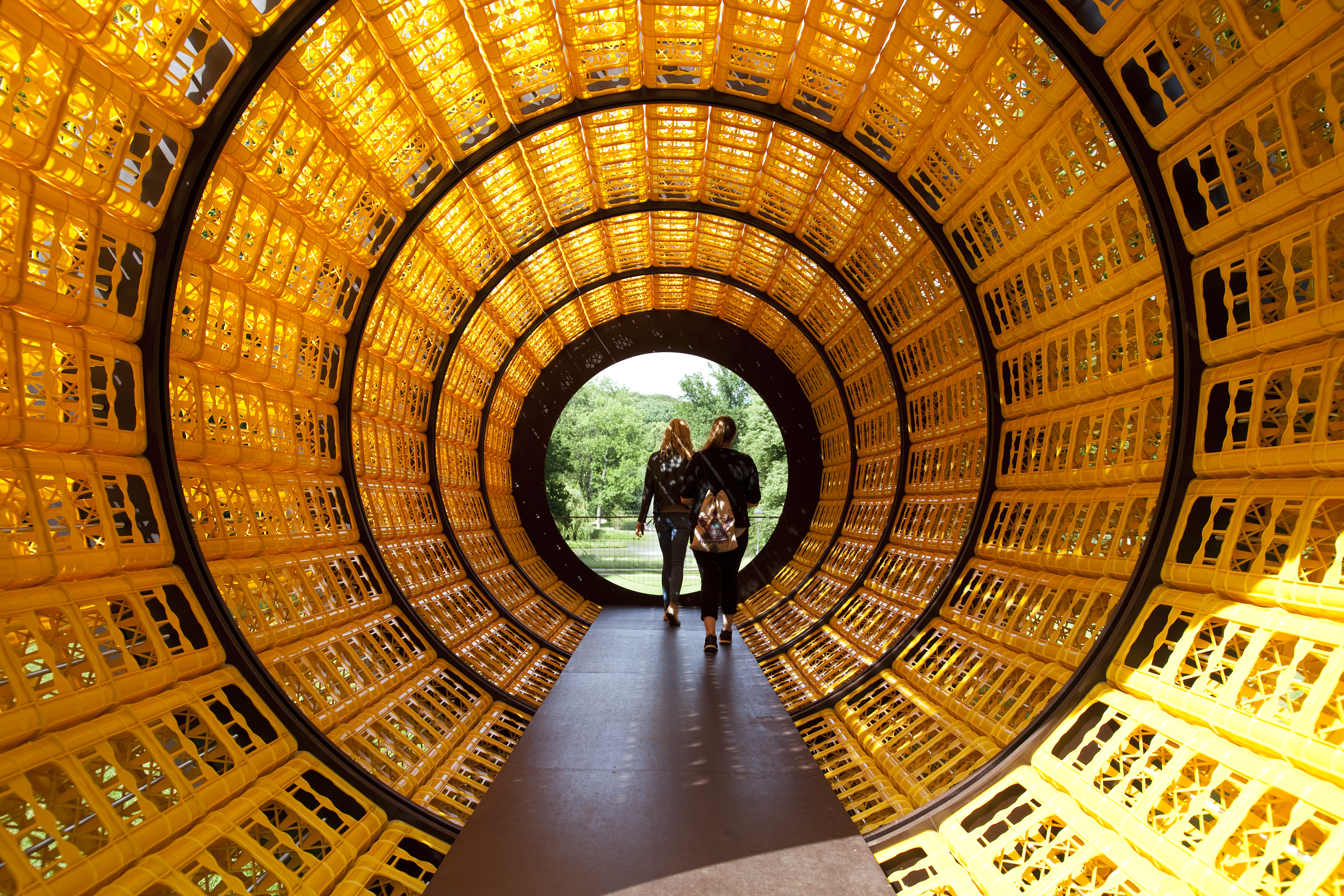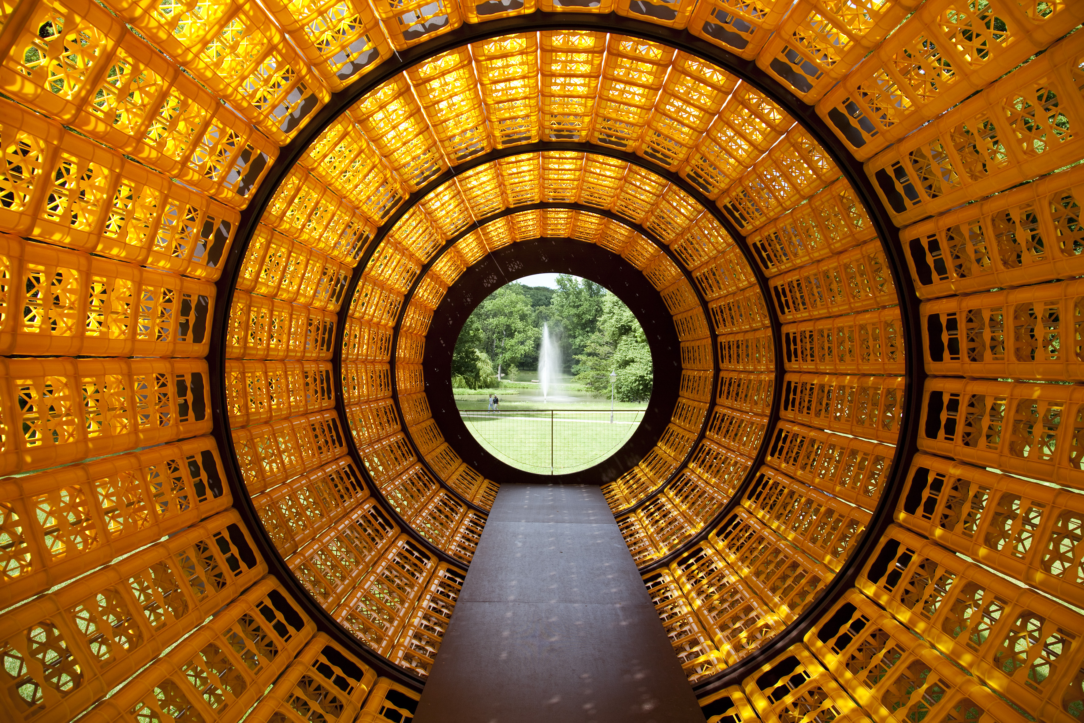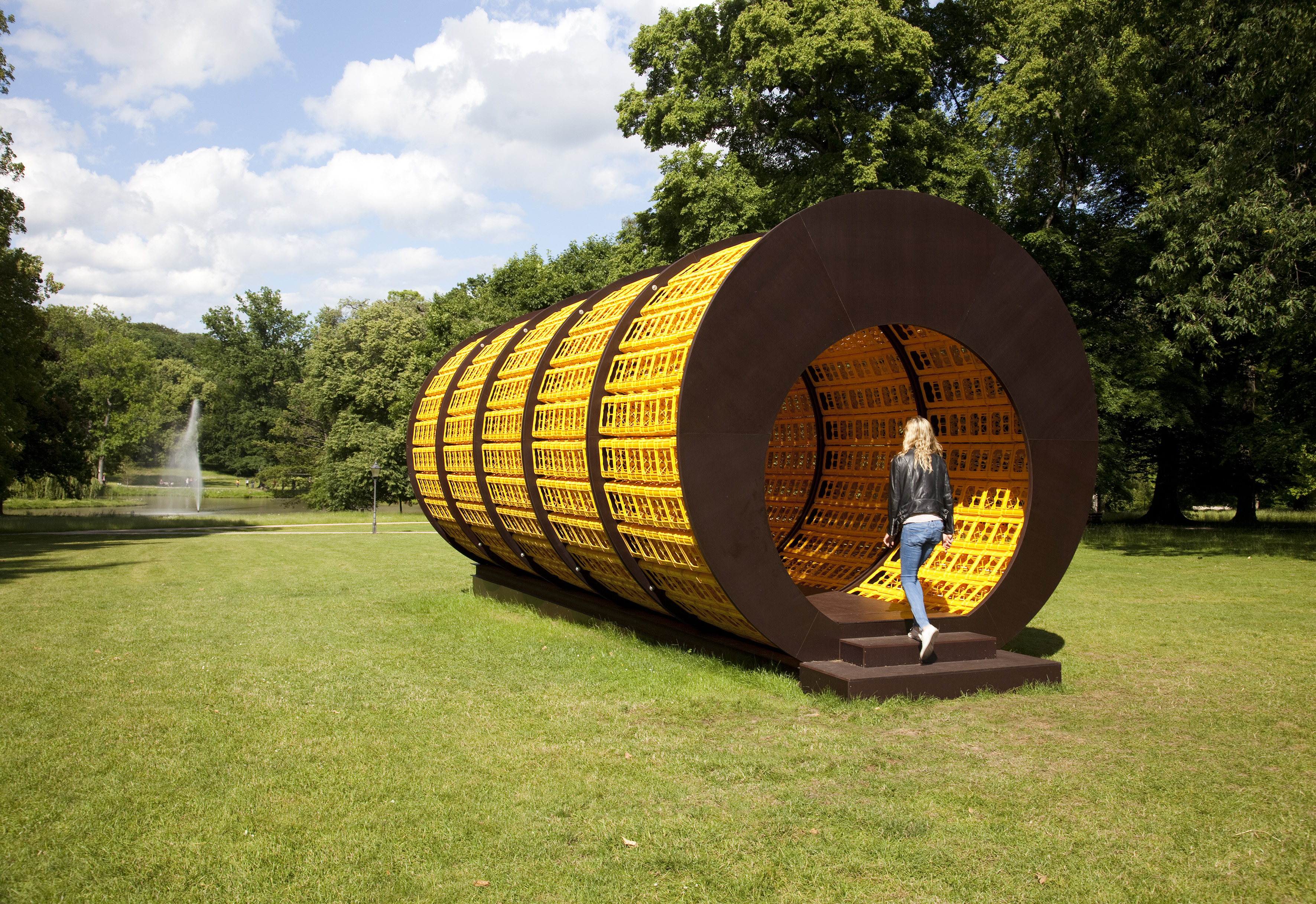 Wolfgang Winter und Berthold Hörbelt arbeiten seit 1992 zusammen. Für ihre interaktiven Skulpturen verwenden Sie meist Alltagsprodukte wie Federkernspiralen oder Autorückleuchten. Früh entdeckten sie die konstruktiven und ästhetischen Qualitäten industriell gefertigter Getränkekisten für ihre Arbeiten: Die Kästen lassen sich stapeln und verbinden, sind wetterbeständig, auf ganz eigene Weise lichtdurchlässig und bilden – als architektonisches Material verwendet – eine elegante Rippenstruktur aus. Bereits für die Skulptur.Projekte Münster, die Venedig-Biennale und viele Orte in Europa, Asien und den USA baute das Künstlerduo daraus seine begehbaren „Kastenhäuser“ – Skulpturen, die als öffentliche Begegnungs-, Kommunikations- oder Ruhestätten dienen. Für Blickachsen 12 entwarfen Winter/Hoerbelt nun eine elf Meter lange Röhre aus 900 gelben Wasserkästen, mit der sie die Lennésche Blickachse vom Bad Homburger Kurhaus zum Kurparkweiher und seiner Fontäne akzentuieren. Die Arbeit mit dem Titel „Donnerstags ist alles gut“ eignet sich sowohl als Ort der Begegnung wie auch zum Ausruhen und Genuss des Ausblicks auf die Wasserfontäne. Bei Sonnenschein offenbaren die Getränkekisten ihre überraschende Schönheit, wenn sie das Licht aufnehmen, es in kleine Lichtpunkte filtern und ihre Farbe voll erstrahlen lassen.