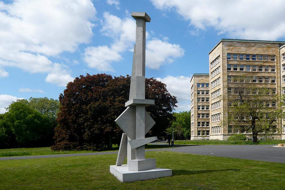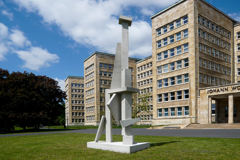 Unmittelbar vor dem Haupteingang des Poelzig-Baus auf dem Frankfurter Campus Westend setzt bei Blickachsen 12 die beinahe acht Meter hohe Betonskulptur „Hangend Vlak“ (Hängende Fläche) von Ruud Kuijer einen starken Akzent. Auch sie wurde – wie die kleineren Betonarbeiten Kuijers – in einem Stück gegossen. Trotz ihrer Größe und des immensen Gewichts von 13 Tonnen vermittelt die Arbeit den Eindruck von Dynamik und spielerischer Leichtigkeit. Unterschiedliche Pfeiler, Blöcke und Platten scheinen in labilem Gleichgewicht aufeinander zu stehen oder zu liegen, aneinander zu lehnen oder sich – wie die titelgebende ‚Fläche‘ – hängend der Schwerkraft zu entziehen. Die lose Anordnung der Formelemente dieser Skulptur kontrastiert an ihrem Aufstellungsort die strenge Geometrie des Universitäts-Gebäudes. Dabei steht das Material des lichtgrauen Betons der Skulptur im Dialog mit dem gelbbraunen Naturstein der Gebäudefassade. Drei weitere charakteristische Werke Ruud Kuijers sind auf dem Campus-Gelände hinter dem Poelzig-Bau installiert. Wie in Bad Vilbel und in Eschborn, sind auch hier die überlebensgroßen Skulpturen mit den Titeln „Kolomskulptuur IV“, „Staffetta III“ und „Vensterskulptuur I“ zu einer kontrastreichen Gruppe zusammengestellt.