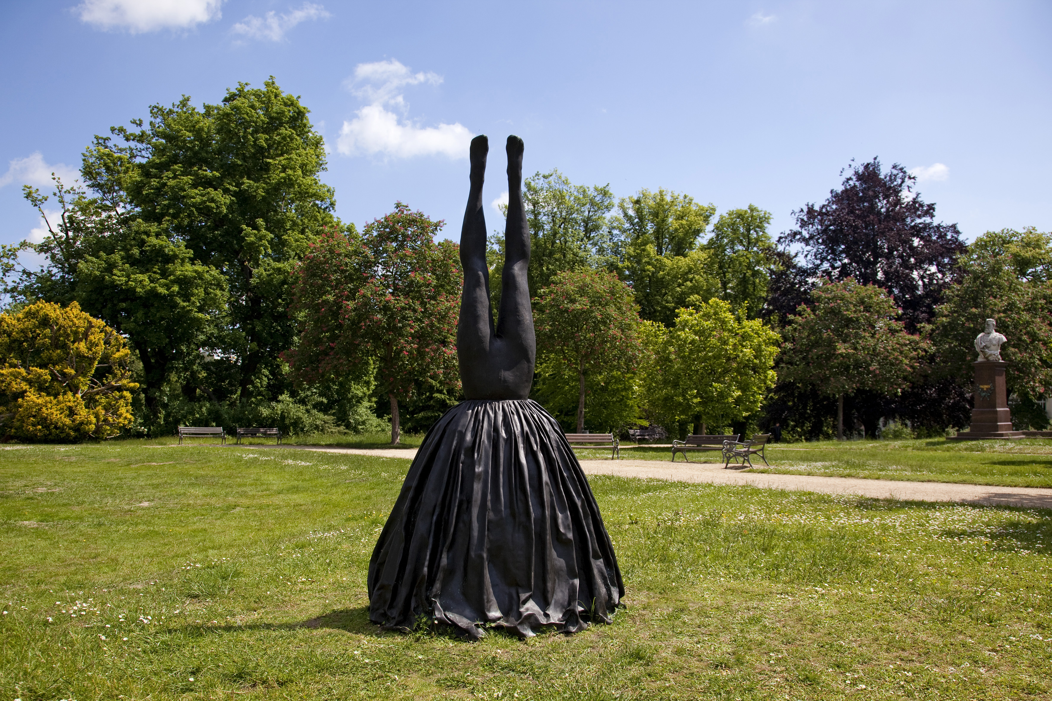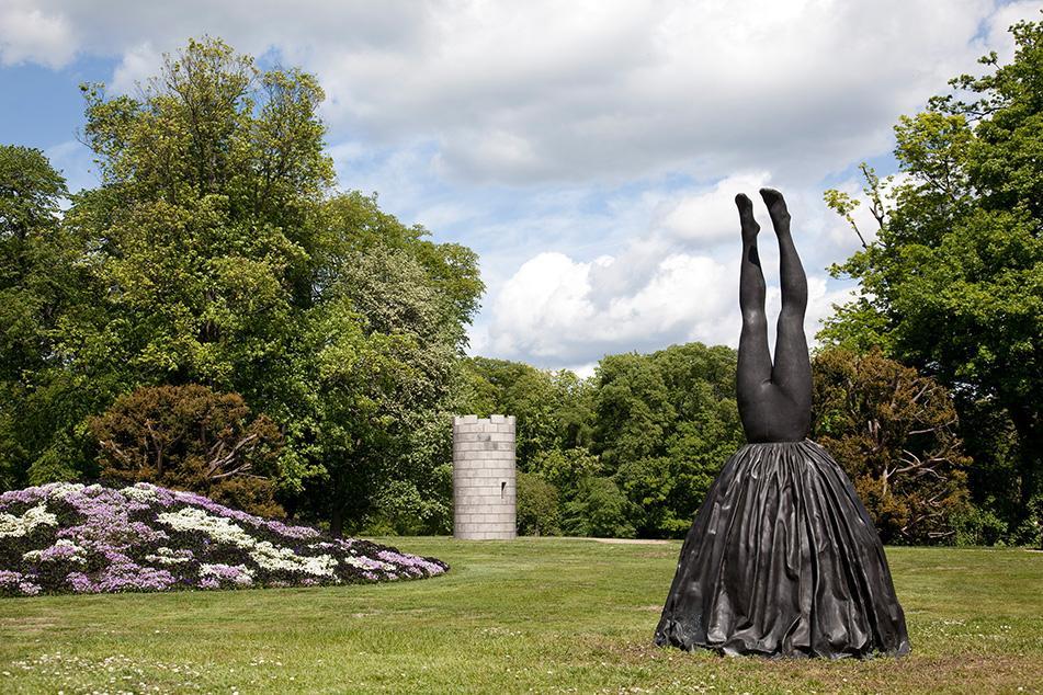Charlotte Gyllenhammar begann ihre künstlerische Laufbahn als Malerin, wandte sich jedoch nach dem Abschluss ihres Studiums in Götheborg, Stockholm und London bald der Skulptur zu. Die Installation „Die for You“, für die sie 1993 eine 120 Jahre alte entwurzelte Eiche mit der Krone nach unten über eine Stockholmer Einkaufsstraße hängte, verhalf ihr zum internationalen Durchbruch. Seitdem ist die Verkehrung von Dingen und Figuren ein wiederkehrendes Motiv in Gyllenhammars Werk. Ihre häufig emotional aufgeladenen Arbeiten beschäftigen sich mit Themen wie Isolation und Zuflucht, Innen- und Außenraum, Privatsphäre und Öffentlichkeit. Bei Blickachsen 12 ist die Künstlerin mit zwei Arbeiten im Bad Homburger Kurpark vertreten. Die tiefschwarz patinierte Bronze mit dem Titel „Night, Descend“ (Nacht, Herabsinken) zeigt eine auf dem Kopf stehende weibliche Figur, deren herabfallender Rock sie von der Hüfte bis zum Kopf umfängt. Die Entblößung der Beine wird kontrastiert durch den unter dem voluminösen Rock vorstellbaren abgeschlossenen Raum. Hinter den massiven Wänden des vier Meter hohen Wehrturms der Arbeit „Traum“ können Betrachter nur durch drei kleine Öffnungen den Innenraum einsehen, in dem die zarte und sanft erleuchtete Miniatur eines goldenen Heißluftballons sichtbar wird.