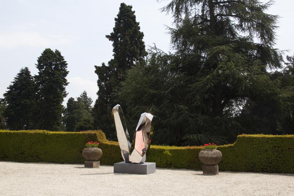 Arik Levy ist mit seinen unverwechselbaren „Rock“-Skulpturen, die er in verschiedenen Materialien und Dimensionen ausführt, im internationalen Kunstbetrieb fest etabliert. Bei Blickachsen 12 korrespondieren die in Bad Homburg und Frankfurt ausgestellten Werke Levys mit drei formal unterschiedlichen Beispielen seiner abstrakten „Gesteinsbrocken“ in Kronberg. Die spiegelpolierten Edelstahl-Skulpturen sind künstlerisch ausgewogene, präzise in Proportion und Richtung austarierte Formfindungen, die von mineralischen, häufig kristallinen Formen inspiriert, jedoch nicht als Abformungen der Natur zu verstehen sind. Je nach Betrachterposition, Lichtverhältnissen und Jahreszeit verändert sich ihr Erscheinungsbild. Auf der Terrasse von Schloss Friedrichshof, in dem heute das Schlosshotel Kronberg untergebracht ist, greift die zweiteilige Arbeit „RockStoneFusion Vertical 170“ dynamisch in den Raum aus und wird durch die Vielfachreflexionen der Umgebung zum Bindeglied zwischen den gebauten und den natürlichen Formen. Im Rosengarten der Schlossanlage hingegen, scheint die Natur im „RockStoneImplosed 207“ mit seinen teils ebenen, teils konkav gewölbten Flächen zu zerfließen. Daneben intensiviert das fein ausbalancierte Gleichgewicht des mehrteiligen „RockTower 131“ die Raumerfahrung des Betrachters.