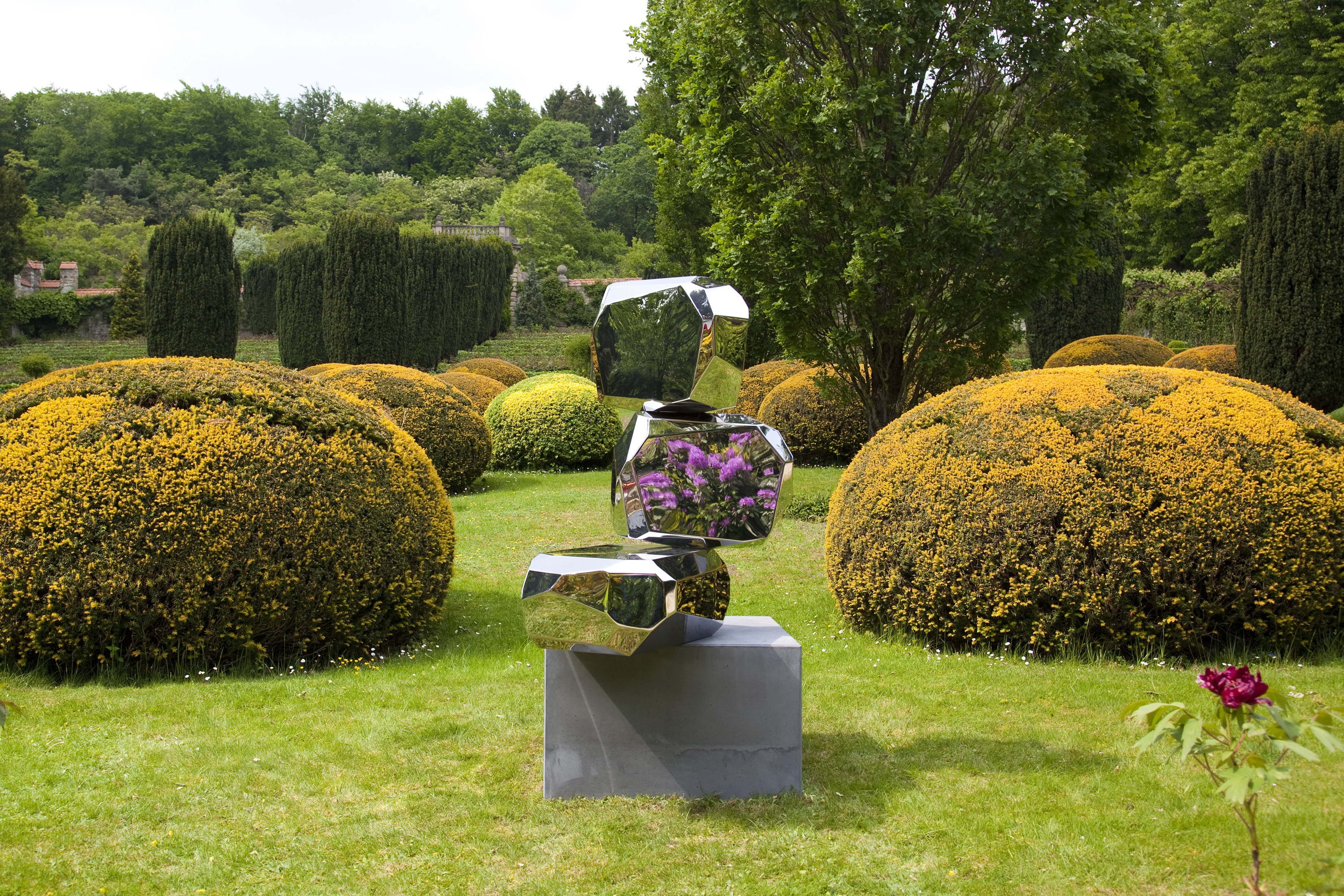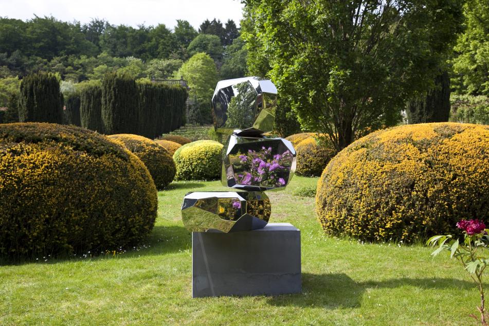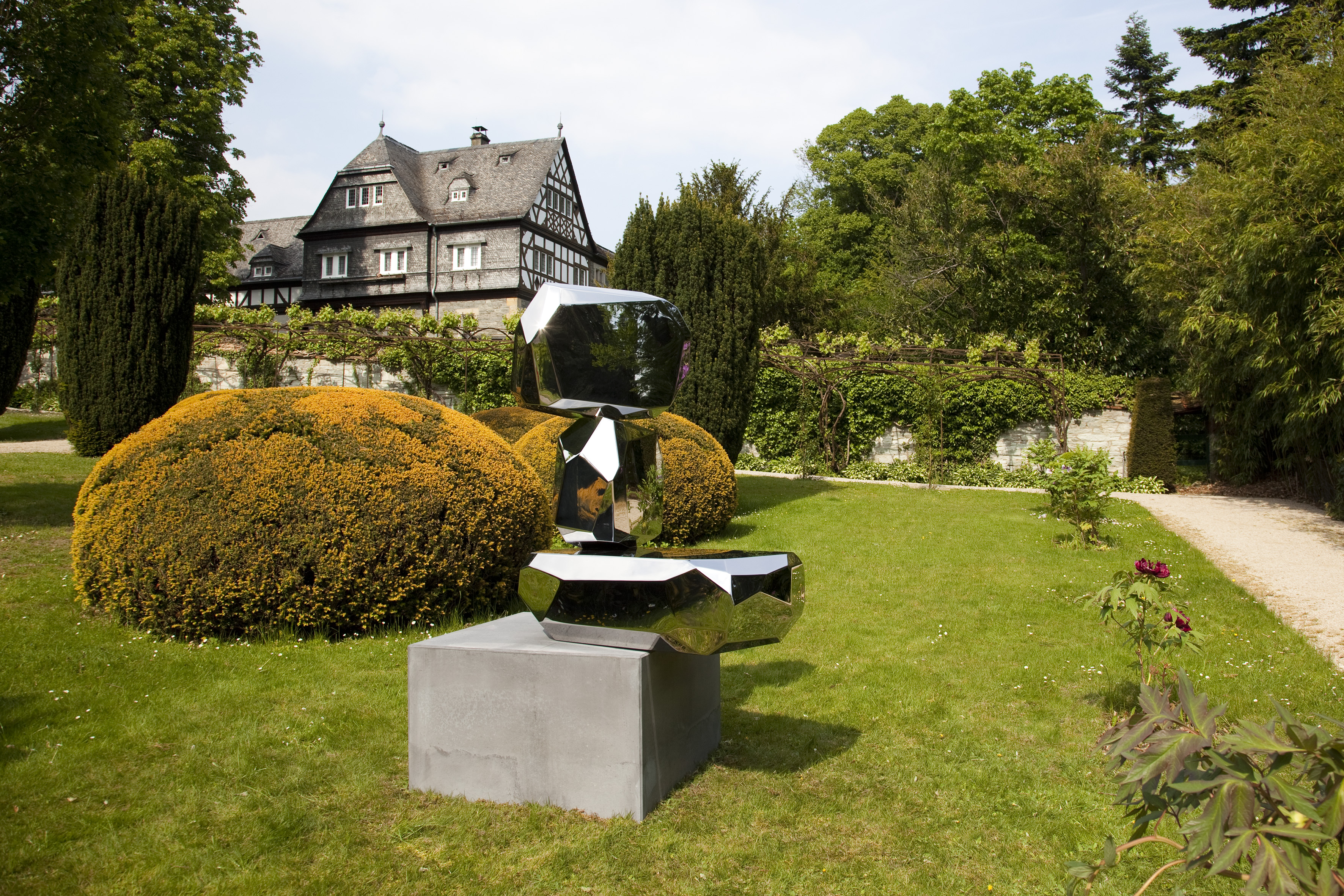 Arik Levy ist mit seinen unverwechselbaren „Rock“-Skulpturen, die er in verschiedenen Materialien und Dimensionen ausführt, im internationalen Kunstbetrieb fest etabliert. Bei Blickachsen 12 korrespondieren die in Bad Homburg und Frankfurt ausgestellten Werke Levys mit drei formal unterschiedlichen Beispielen seiner abstrakten „Gesteinsbrocken“ in Kronberg. Die spiegelpolierten Edelstahl-Skulpturen sind künstlerisch ausgewogene, präzise in Proportion und Richtung austarierte Formfindungen, die von mineralischen, häufig kristallinen Formen inspiriert, jedoch nicht als Abformungen der Natur zu verstehen sind. Je nach Betrachterposition, Lichtverhältnissen und Jahreszeit verändert sich ihr Erscheinungsbild. Auf der Terrasse von Schloss Friedrichshof, in dem heute das Schlosshotel Kronberg untergebracht ist, greift die zweiteilige Arbeit „RockStoneFusion Vertical 170“ dynamisch in den Raum aus und wird durch die Vielfachreflexionen der Umgebung zum Bindeglied zwischen den gebauten und den natürlichen Formen. Im Rosengarten der Schlossanlage hingegen, scheint die Natur im „RockStoneImplosed 207“ mit seinen teils ebenen, teils konkav gewölbten Flächen zu zerfließen. Daneben intensiviert das fein ausbalancierte Gleichgewicht des mehrteiligen „RockTower 131“ die Raumerfahrung des Betrachters.