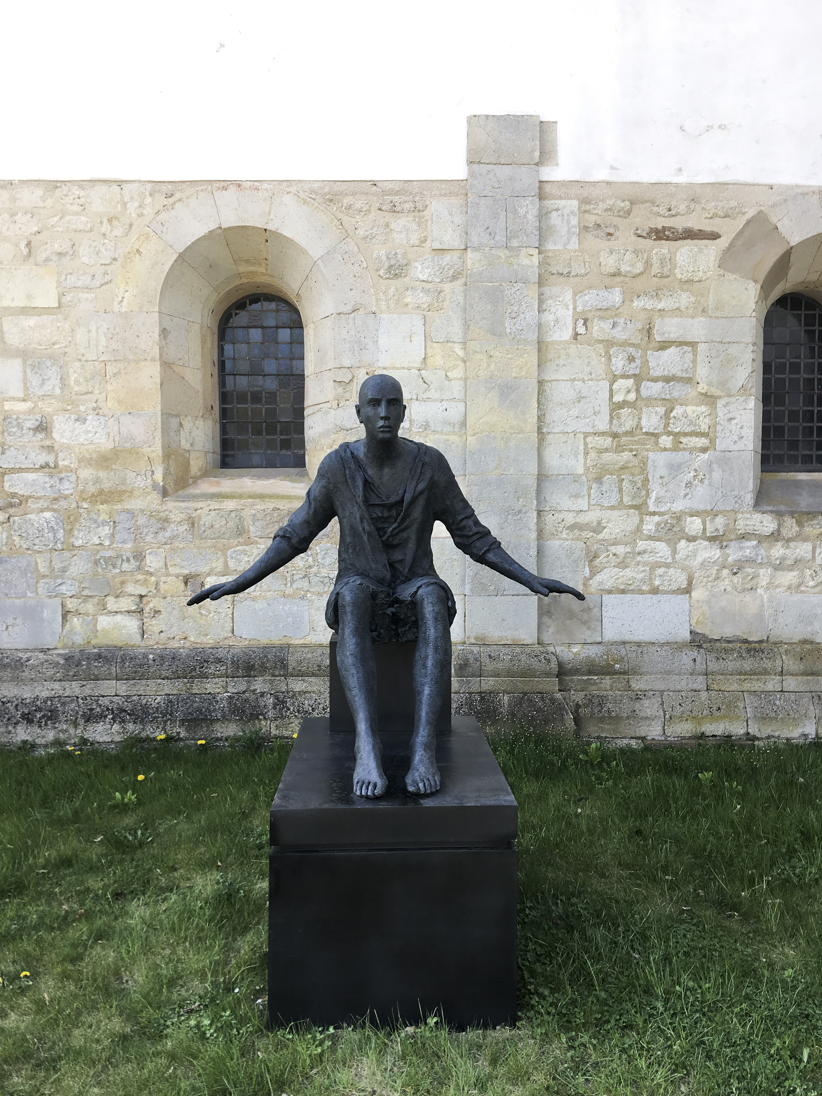 Seit dem Studium der Bildhauerei beschäftigt sich Hanneke Beaumont mit der menschlichen Figur. Die Monumentalskulptur „Stepping Forward“ vor dem Europagebäude in Brüssel hat die Kunstwelt in Europa, Asien und den USA auf ihre Arbeiten aufmerksam gemacht. Meist präsentiert Beaumont ihre überlebensgroßen Figuren aus Terrakotta, Eisen oder Bronze in unangestrengten und nicht-klassischen Posen auf rechtwinkligen Sockeln und Podesten. So auch ihre dauerhaft in Bad Homburg installierte Gruppe „Melancholia I“. Bei Blickachsen 12 bietet der konzentrierte, ruhige Rahmen des Klosters Eberbach der fokussierten Stimmung der neun ausgestellten Bronzeskulpturen einen idealen Rahmen. Balancierend, sitzend oder kniend scheinen die Figuren in ihrer Bewegung innezuhalten. Sind die Körper auch klar definiert, bleiben die Oberflächen schrundig und vage. Sie sind von einfachen Gewändern bedeckt, ohne dass man die Kleidung benennen könnte. Genauso unbestimmt wirken die deutlich modellierten Gesichter, die keine Individualität und keinen Ausdruck zeigen. Beaumont schafft es, durch universale Körperhaltungen individuelle Stimmungen auszudrücken. Dabei thematisiert sie nicht nur das Mensch-Sein. Weil sie die menschlichen Figuren auf Sockeln platziert, interpretiert sie auch die klassische Idee von Skulptur neu.