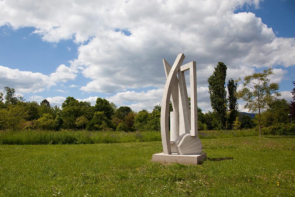 Die skulpturale Artikulation des Raumes steht im Zentrum des Schaffens von Ruud Kuijer, der u. a. an der Akademie der Künste in Berlin gelehrt hat. Er lotet die plastischen Qualitäten verschiedener Formelemente aus und experimentiert mit Gewicht und Statik, Gleichgewicht und Schwerkraft, Bewegung und Gegenbewegung. Dabei entwickelt er eine eigenständige skulpturale Formensprache und schließt durch seine Materialwahl zugleich an die Verwendung des Baustoffs Beton in der Architekturgeschichte seit den 1920er-Jahren an. Häufig wählt er auch ein architektonisches Element als Ausgangspunkt seiner Werke. Beispielhaft hierfür steht in Eschborn bei Blickachsen 12 seine „Vensterskulptuur V“. Entscheidend sind auch hier Bewegungsverschiebungen, Gewichtsverlagerungen und Durchblicke. Kuijer belässt all seine Werke materialsichtig, und betont so ihren abstrakten Charakter – selbst wenn er diesen durch augenzwinkernd eingearbeitete Objekte wieder aufbricht, wie in „Staffetta II“ und der in Eschborn ausgestellten Arbeit ohne Titel. An jedem der von Ruud Kuijer bespielten Standorte der Blickachsen 12 ist eine Gruppe seiner Arbeiten zu sehen, die unterschiedliche Ausprägungen seines Formenkanons vorstellt und Kontraste ebenso wie Gemeinsamkeiten aufzeigt.