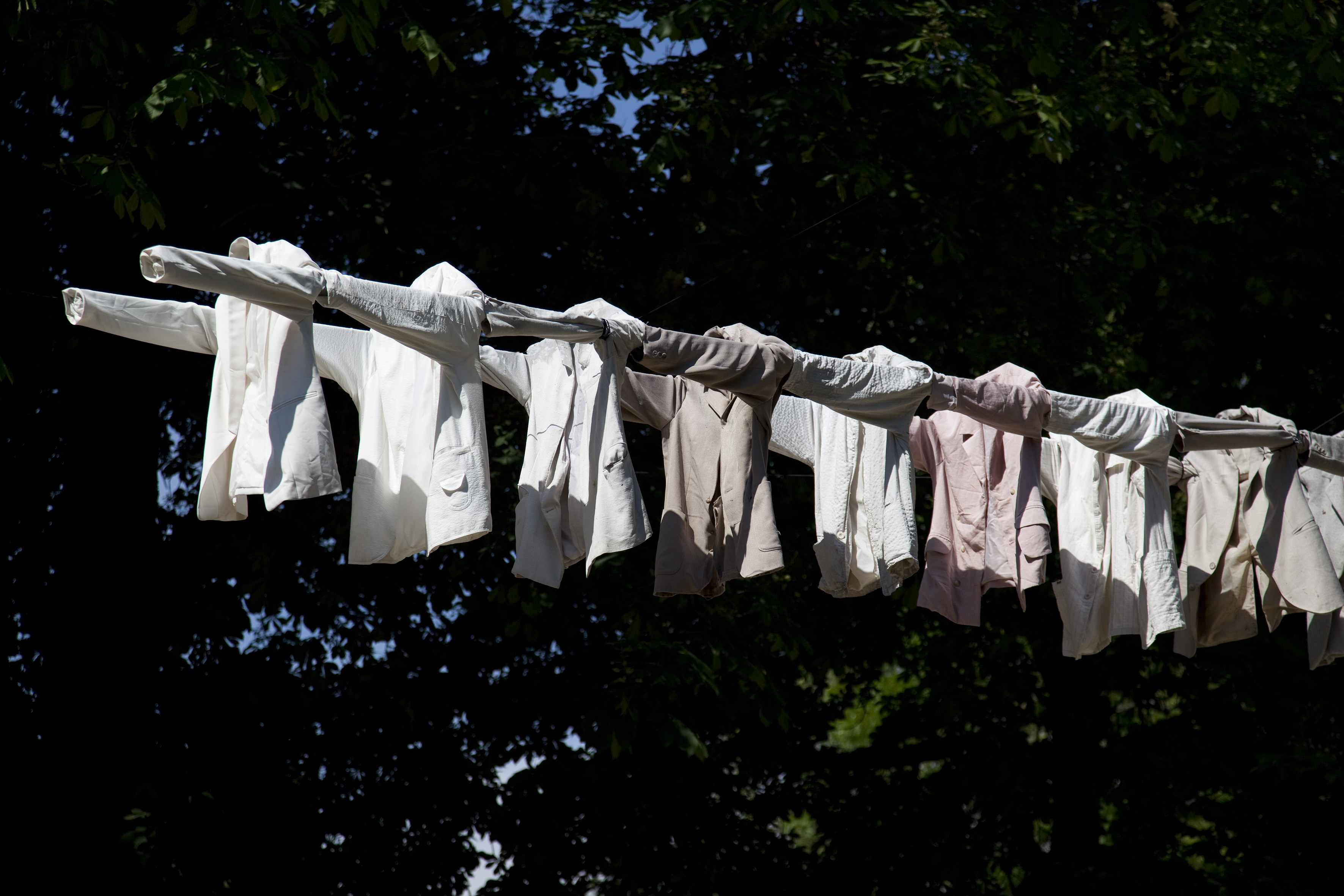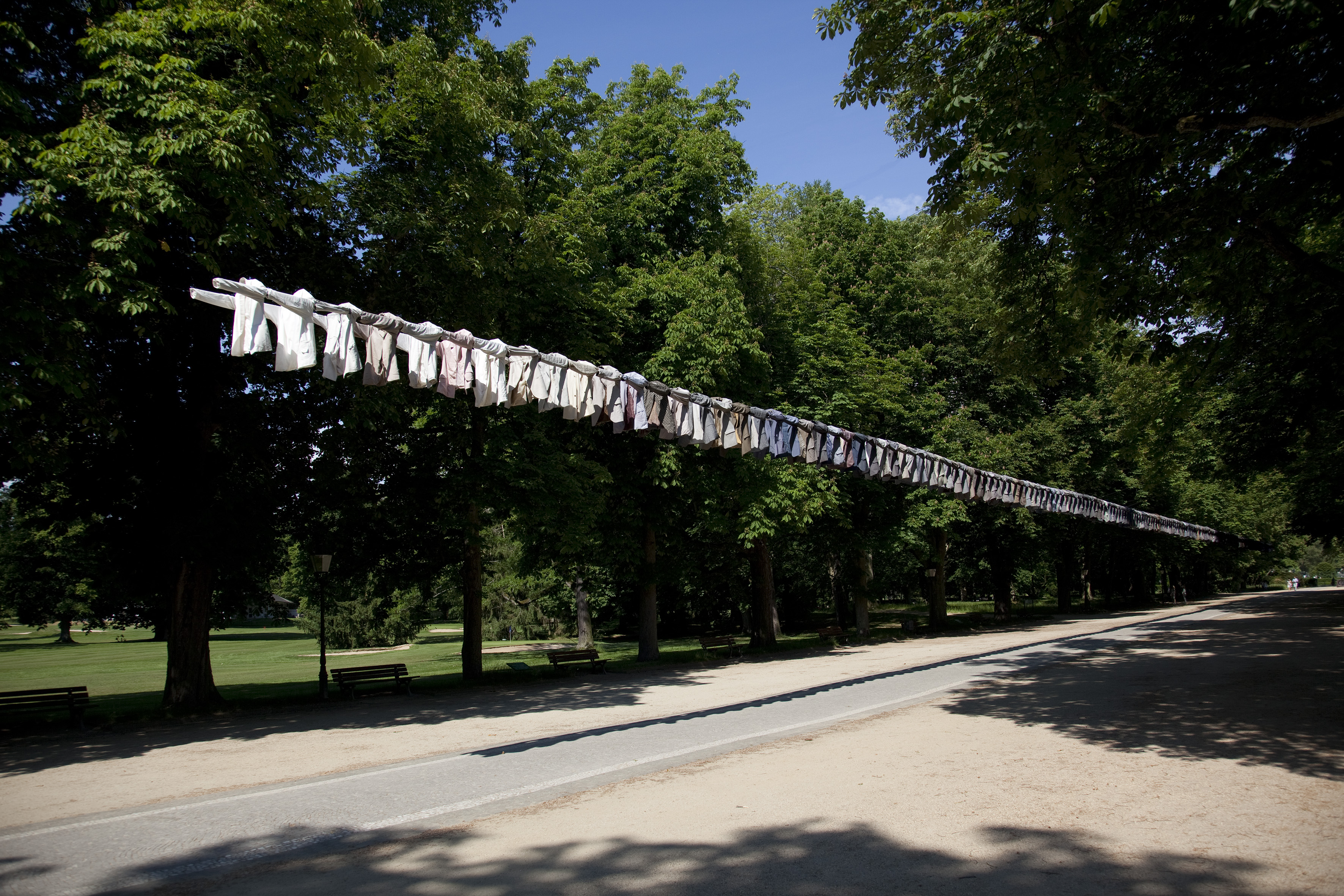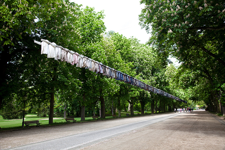 Als eine der bekanntesten zeitgenössischen Kunstschaffenden Finnlands hat Kaarina Kaikkonen bereits weltweit ausgestellt. Sie verwendet für ihre ortsspezifischen Installationen ausschließlich gebrauchte Textilien, die sie unter Beachtung der verschiedenen Farben, Formen und Materialien in immer neuen Konstellationen zusammenfügt. Ausgehend von persönlichen Erfahrungen spielt sie dabei mit der Eigenschaft von Kleidungsstücken, etwas von der Identität ihrer Träger anzunehmen und selbst in deren Abwesenheit zu bewahren. Manche Stücke hebt man bewusst auf, der Erinnerung wegen: Im Duft, in den Abnutzungsspuren und den Knitterfalten sind Spuren eines Menschen erfahrbar. Andererseits reinigt man Second-Hand-Ware, um solche Erinnerungsträger zu tilgen. „There Must Be a Way Out of Here“ spielt mit dem Verweis auf Körper, die nicht anwesend sind: Die 200 Jacketts, die bei Blickachsen 12 über der Brunnenallee im Bad Homburger Kurpark aufgereiht sind, sind voluminös und dennoch leer. Durch ihre Anzahl und die Wiederholung der Pose verschwinden die Kleidungsstücke in der Anonymität, als ginge ein persönliches Schicksal in einem sozialen Gefüge unter; gleichzeitig suggeriert die Positionierung der auf die Schultern des „Vordermannes“ gelegten Ärmel Gemeinschaft und Zusammenhalt.