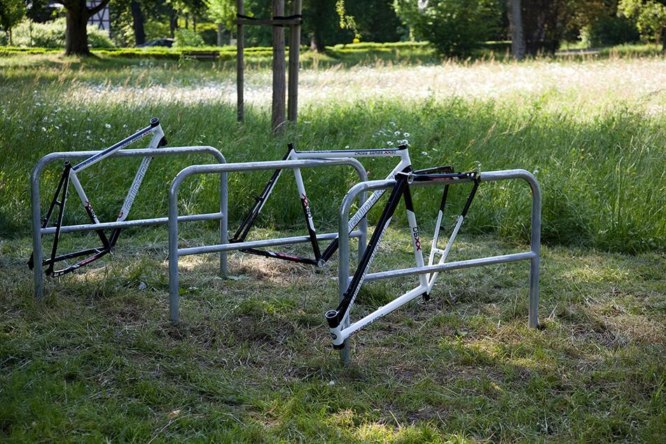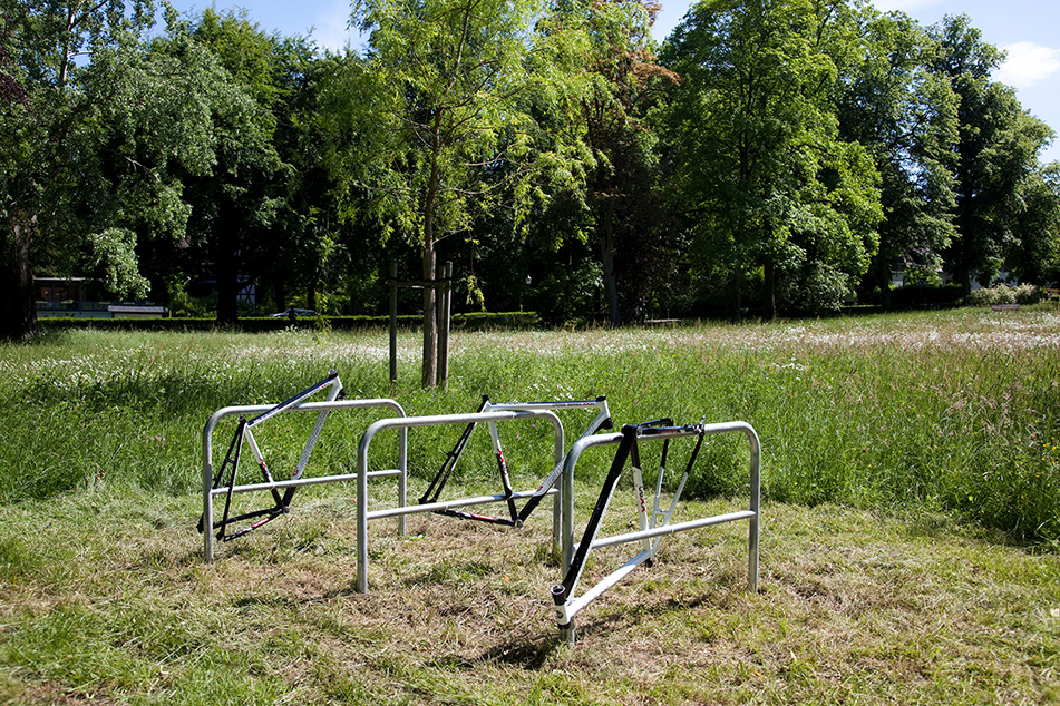Sofia Hultén widmet sich in ihrem Schaffen den Objekten, die uns umgeben. Sie arbeitet mit gebrauchten, auch mit gefundenen Gegenständen. In Installationen und Videoarbeiten lässt sie diese oft in einem neutralen Raum für sich stehen; so fokussiert sie die Aufmerksamkeit der Betrachter auf ihre Eigenschaften, unabhängig von ihrer Funktion für die Nutzer. Durch diese Perspektive wird klar, dass die Materialität, der Gebrauchs- und der Tauschwert von Dingen ganz unterschiedliche Aspekte sind, deren Verhältnis zueinander verschoben werden kann. Gleichzeitig thematisiert Hultén – häufig mit einem Augenzwinkern – unsere Beziehung zu den Objekten, die sie vorstellt. Die drei an Fahrradgeländern hängenden Rahmen teurer Sporträder, die „This, That, Other“ bilden, würden am Straßenrand in einer Großstadt nicht auffallen; im Kurpark, auf einer Wiese abseits des Weges, erregen sie jedoch Aufmerksamkeit. Bei genauerem Hinsehen fällt ein absurdes Detail auf: Die Fahrradrahmen scheinen um das Geländer geflochten zu sein, was genauso unmöglich ist, wie sie wieder zu befreien und ihrem ursprünglichen Nutzen zuzuführen. Ähnliche Arbeiten zeigte Sofia Hultén, die in Berlin lebt und arbeitet, bereits in Einzelausstellungen in ganz Europa, etwa im Museum Tinguély in Basel oder in der Fundació Joan Miró in Barcelona.