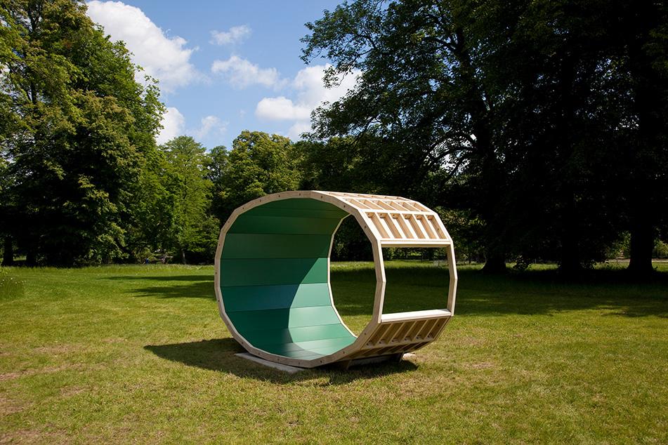 Mit zwei Werken ist Leunora Salihu bei den Blickachsen 12 vertreten. Nach dem Abschluss verschiedener Studien in Pristina und Kiel studierte Salihu Bildhauerei an der Kunstakademie Düsseldorf, wo sie Meisterschülerin bei Tony Cragg war und sehr schnell ein eigenständiges künstlerisches Profil entwickelte. Heute lehrt die Lothar-Fischer-Preisträgerin an der Universität Gießen. In ihren Skulpturen und modularen Raumkörpern untersucht Salihu architektonische Formprinzipien und die Ausdrucksmöglichkeiten verschiedener Materialien. Gleichzeitig beschäftigt sie sich mit der Suggestion von Bewegung in statischen Objekten: „Ich suche etwas Überzeitliches in Form und Material, gepaart mit zeitlichen Aspekten der Bewegung. Es reizt mich, solche Gegensätze in einem klaren Bild zu verdichten“, führt Salihu aus. So scheint ihr eleganter „Bogen“ aus einer Vielzahl von versetzt aneinandergefügten kleinen Scheiben zu bestehen, die eine bewegte Oberflächenstruktur erzeugen. Zusätzlich lässt seine schmale Rundung an die Beweglichkeit eines aus unzähligen Gliedern gefertigten Metallbandes denken. Der oval-röhrenförmige „Urraum“ zeigt dagegen eine dynamische Spannung zwischen den außen sichtbaren Konstruktionsmodulen und der Innenhaut – und er wirkt, als würde er schaukeln, wenn man ihn beträte.