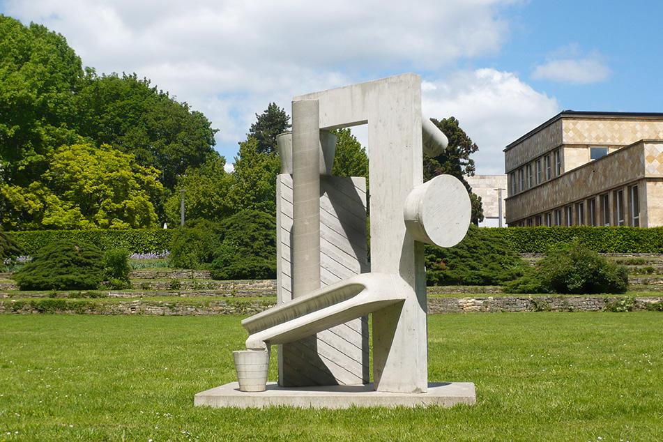 Unmittelbar vor dem Haupteingang des Poelzig-Baus auf dem Frankfurter Campus Westend setzt bei Blickachsen 12 die beinahe acht Meter hohe Betonskulptur „Hangend Vlak“ (Hängende Fläche) von Ruud Kuijer einen starken Akzent. Auch sie wurde – wie die kleineren Betonarbeiten Kuijers – in einem Stück gegossen. Trotz ihrer Größe und des immensen Gewichts von 13 Tonnen vermittelt die Arbeit den Eindruck von Dynamik und spielerischer Leichtigkeit. Unterschiedliche Pfeiler, Blöcke und Platten scheinen in labilem Gleichgewicht aufeinander zu stehen oder zu liegen, aneinander zu lehnen oder sich – wie die titelgebende ‚Fläche‘ – hängend der Schwerkraft zu entziehen. Die lose Anordnung der Formelemente dieser Skulptur kontrastiert an ihrem Aufstellungsort die strenge Geometrie des Universitäts-Gebäudes. Dabei steht das Material des lichtgrauen Betons der Skulptur im Dialog mit dem gelbbraunen Naturstein der Gebäudefassade. Drei weitere charakteristische Werke Ruud Kuijers sind auf dem Campus-Gelände hinter dem Poelzig-Bau installiert. Wie in Bad Vilbel und in Eschborn, sind auch hier die überlebensgroßen Skulpturen mit den Titeln „Kolomskulptuur IV“, „Staffetta III“ und „Vensterskulptuur I“ zu einer kontrastreichen Gruppe zusammengestellt.