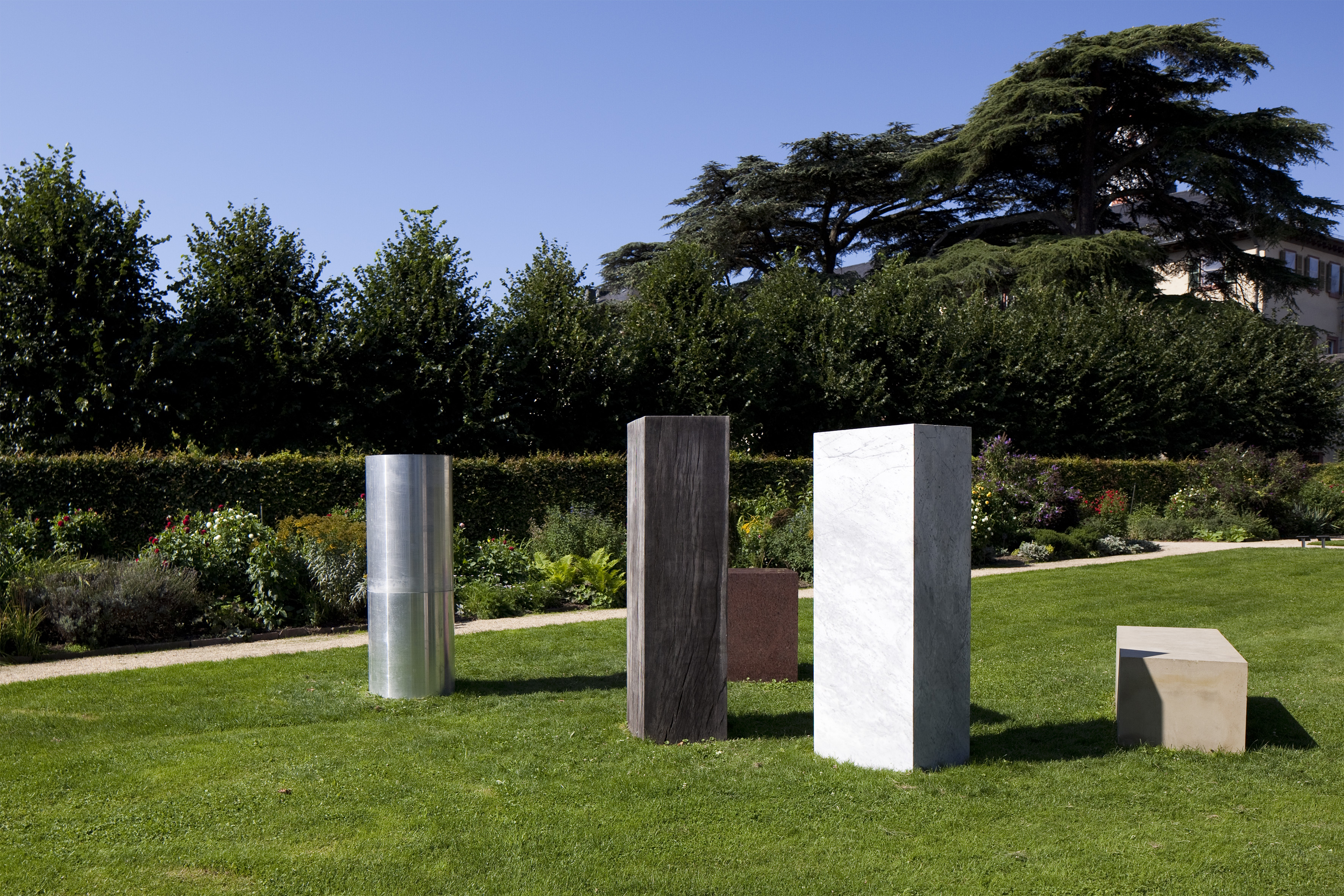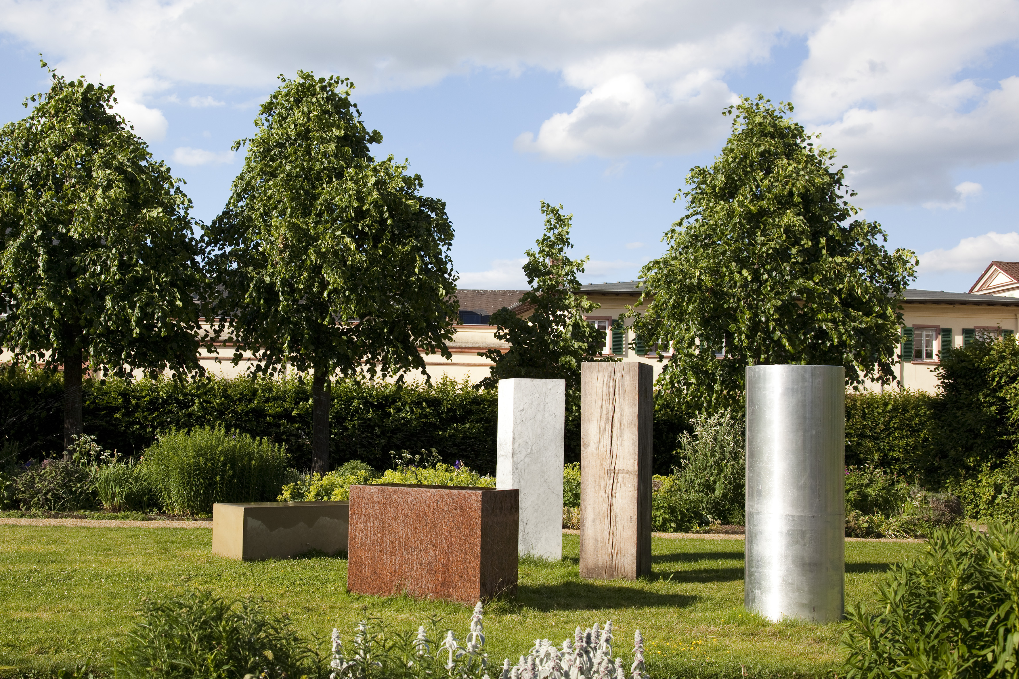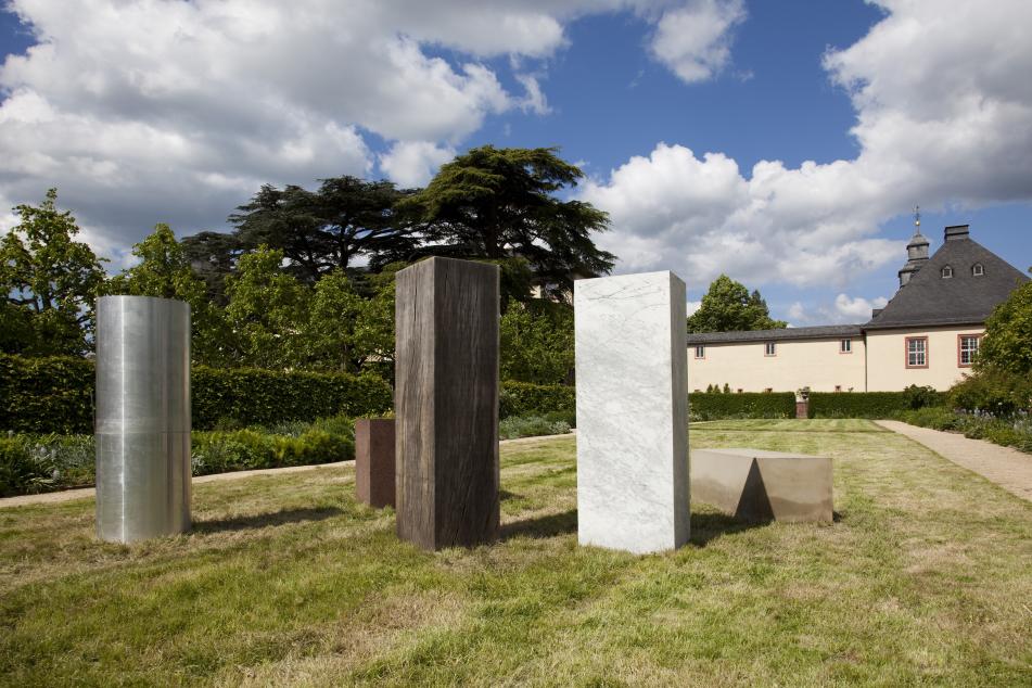 Mit ihren skulpturalen und installativen Arbeiten ist Alicja Kwade bereits in jungen Jahren der internationale Durchbruch gelungen. Ihre Werke, die durch subtile Objektkonstellationen Altbekanntes neu beleuchten oder Traditionen der modernen Kunst kommentieren, faszinieren die Besucher von Ausstellungen weltweit. Auch bei den Blickachsen 11 avancierte Kwades Installation „Big Be-Hide“ zu einem der Publikumsmagnete: Ein Findling, dessen Aluminiumabguss und ein dazwischenstehender zweiseitiger Spiegel spielten mit der Wahrnehmung der Betrachter. In Blickachsen 12 lenkt die Künstlerin nun mit ihrer Arbeit „Wächter (Anschauungsvorstellung)“ das Augenmerk auf fünf bildhauerische Materialien, auf ihre Beschaffenheit, Farbigkeit und Möglichkeiten. Die abstrakte Komposition umfasst vier unterschiedlich proportionierte und ausgerichtete Blöcke aus Carrara-Marmor, Rosengranit, Sandstein und Eichenholz sowie einen lebensgroßen Zylinder aus Aluminium. Die Objekte erscheinen als Rohmaterial für Skulpturen, die erst noch entstehen müssen. So regt Kwade mit ihren im Bad Homburger Schlosspark positionierten „Wächtern“ die Vorstellung der Betrachter an, und thematisiert zugleich den jahrhundertealten Topos des Künstlergenies, das bereits im unbehauenen Block die abgeschlossene Figuration imaginiert.