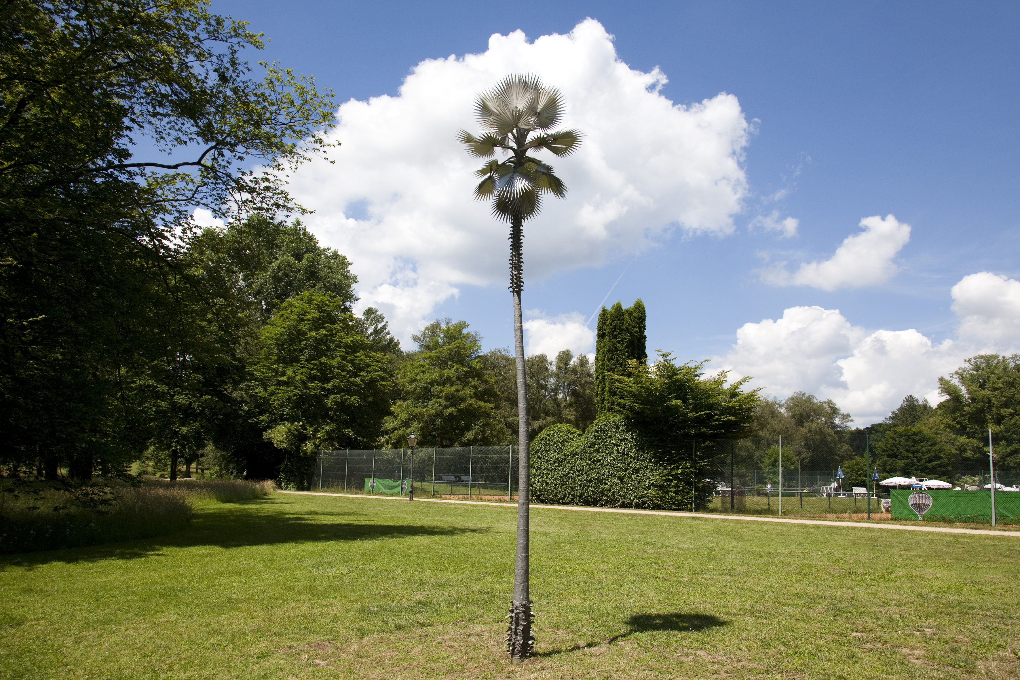 Im Kurpark Bad Homburgs stehen in Sichtweite des Tennisclubs während der Blickachsen 12 zwei rund fünf Meter hohe, silbrig glänzende Palmen. Es sind von David Zink Yi in verkleinertem Maßstab nachgebildete Exemplare der bis zu 35 Meter hoch aufragenden Fächerpalme Washingtonia robusta, des Wahrzeichens kalifornischer Metropolen. Zink Yi hat in München und Berlin studiert und bereits europaweit sowie in Nord- und Südamerika ausgestellt. Er versteht sich dezidiert als Bildhauer, auch wenn er in unterschiedlichen Gattungen wie Video, Malerei oder eben Skulptur arbeitet. Im Zentrum seiner Arbeit steht die Frage nach Identität und Verfremdung. Wenn vertraute Dinge durch künstlerische Eingriffe fremd werden, stellt sich die Frage, ob sie zur Identifikation und Selbstvergewisserung noch taugen. In seinen urban wirkenden „Washingtonia“-Palmen aus Edelstahl kontrastiert Zink Yi die Natürlichkeit der Form mit der kühlen Künstlichkeit des Materials. Zugleich assoziiert er die Werke mit der Religion der afrikanischen Yoruba und den darauf beruhenden afroamerikanischen Religionen: Darin wird die Palme als Sitz des populären Donnergottes Changó angesehen. Somit vereint der Künstler in „Washingtonia“ Aspekte gänzlich unterschiedlicher Identitäten – das Andere und Fremde im Vertrauten steht im Vordergrund.