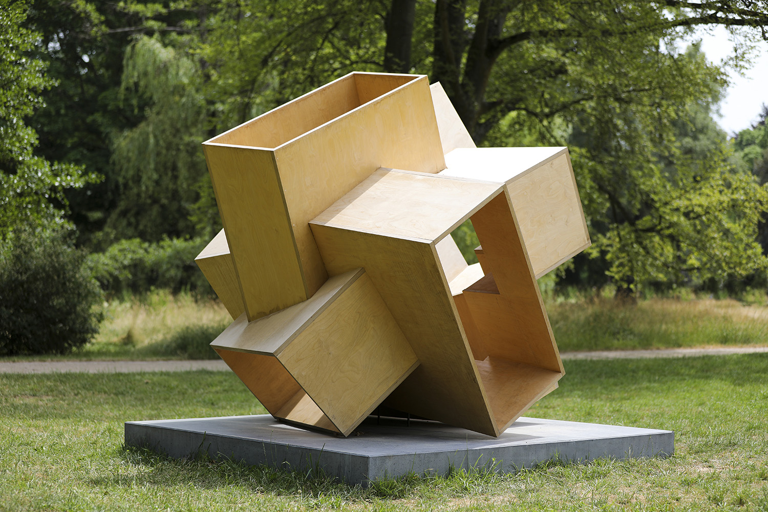 Oliver Kruse arbeitet multidisziplinär an der Schnittstelle von Skulptur und Architektur. In Installationen, Interventionen und Raumkonzepten beschäftigt er sich mit der Beziehung von Kunst- und Bauwerken in unterschiedlichen räumlichen Kontexten – mal in urbanen Umgebungen, mal in der freien Landschaft. Die komplexe Durchdringung von Körpern im Raum greift Kruse mit seinem „Interrelate“ (zusammenhängen, zueinander in Beziehung bringen) betitelten Beitrag für die Blickachsen 13 auf. Die im Kurpark platzierte Sperrholzskulptur besteht aus mehreren ineinandergreifenden, je an zwei Seiten offenen Quadern, die beim Umschreiten und Hindurchsehen immer wieder neue Bezüge zueinander und Perspektiven in die Umgebung eröffnen. Als labiles Gleichgewicht und unlösbar gegenseitig durchstoßenes Formgefüge, in dem sich neue Räume und Proportionen ergeben, erinnert die Skulptur in der Materialsichtigkeit, den klaren Linien und geometrischen Formen an zukunftsweisende Bauwerke des zwanzigsten Jahrhunderts.