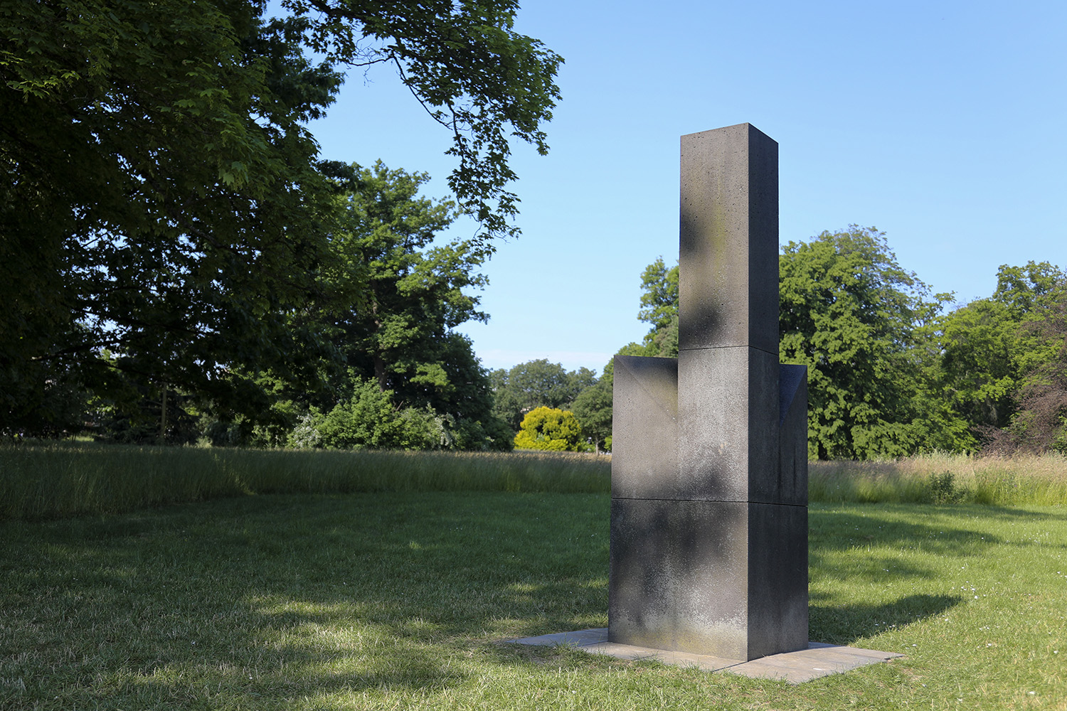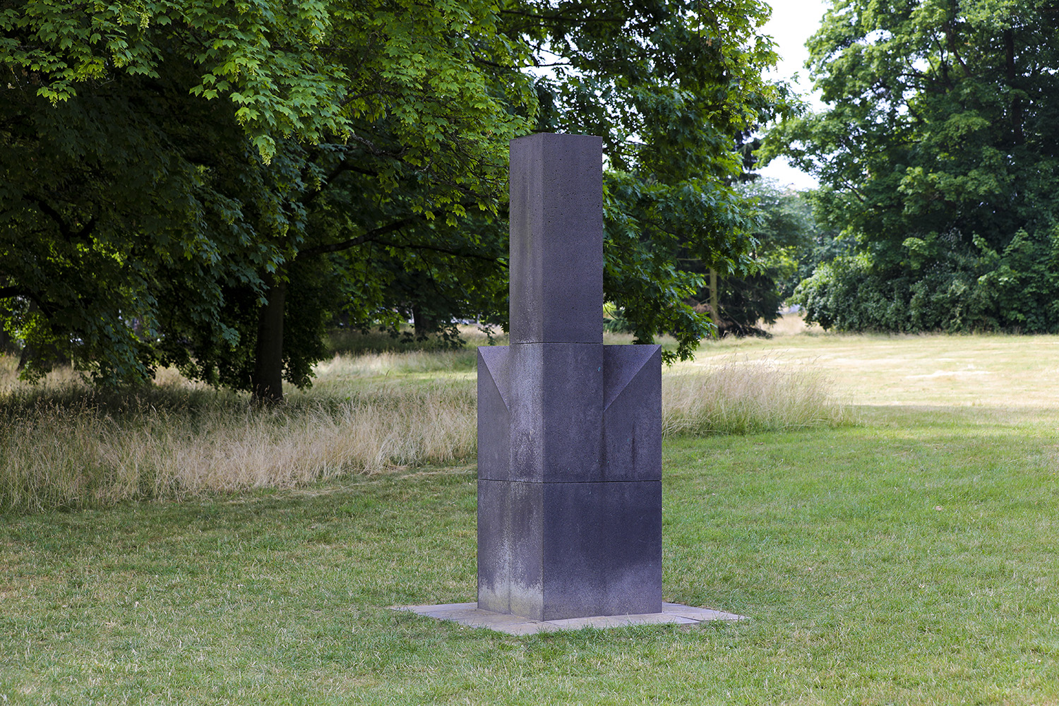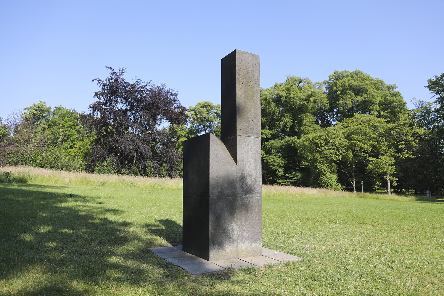 Erwin Heerichs künstlerisches Denken entwickelt sich aus der Zeichnung, in der er von stilisierten Figurinen, Tier- oder Objektdarstellungen rasch den Weg in die geometrische Abstraktion findet. Diese zumeist auf der Grundform des Quadrats basierenden Entwürfe projiziert er mit den für ihn so charakteristischen Kartonplastiken in den Raum. Durch den Kontakt mit dem Gründer der Insel Hombroich gelangte er schließlich dazu, seine Plastiken zu betretbaren Räumen zu skalieren, die sowohl eine äußere wie eine innere Form aufweisen. Als ‘begehbare Skulpturen‘ prägen sie bis heute das Museum und dienen z. T. auch als Ausstellungsräume für die in Hombroich präsentierte Sammlung. Die für Blickachsen 13 in den Kurpark gebrachte Skulptur „Ohne Titel“ besteht aus dunkler Basaltlava mit einer ungewöhnlichen, porigen Oberfläche. In mathematisch exakter Geometrie entwickelt sie sich aus dem quadratischen Grundriss zur verdoppelten Würfelform, auf der – über einem Viertel der Grundfläche – eine Stele in der Höhe dreier Würfelmaße aufragt. Zwei dreieckige Einkerbungen unterstreichen den Eindruck des Architektonischen.