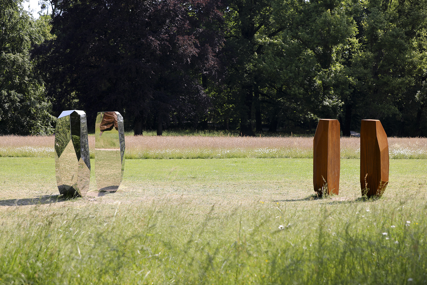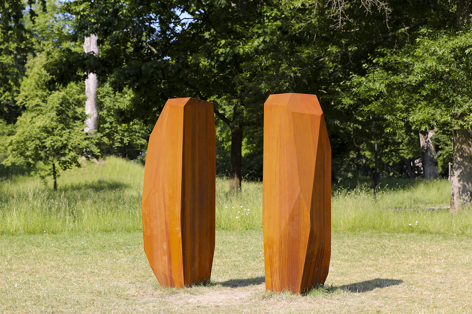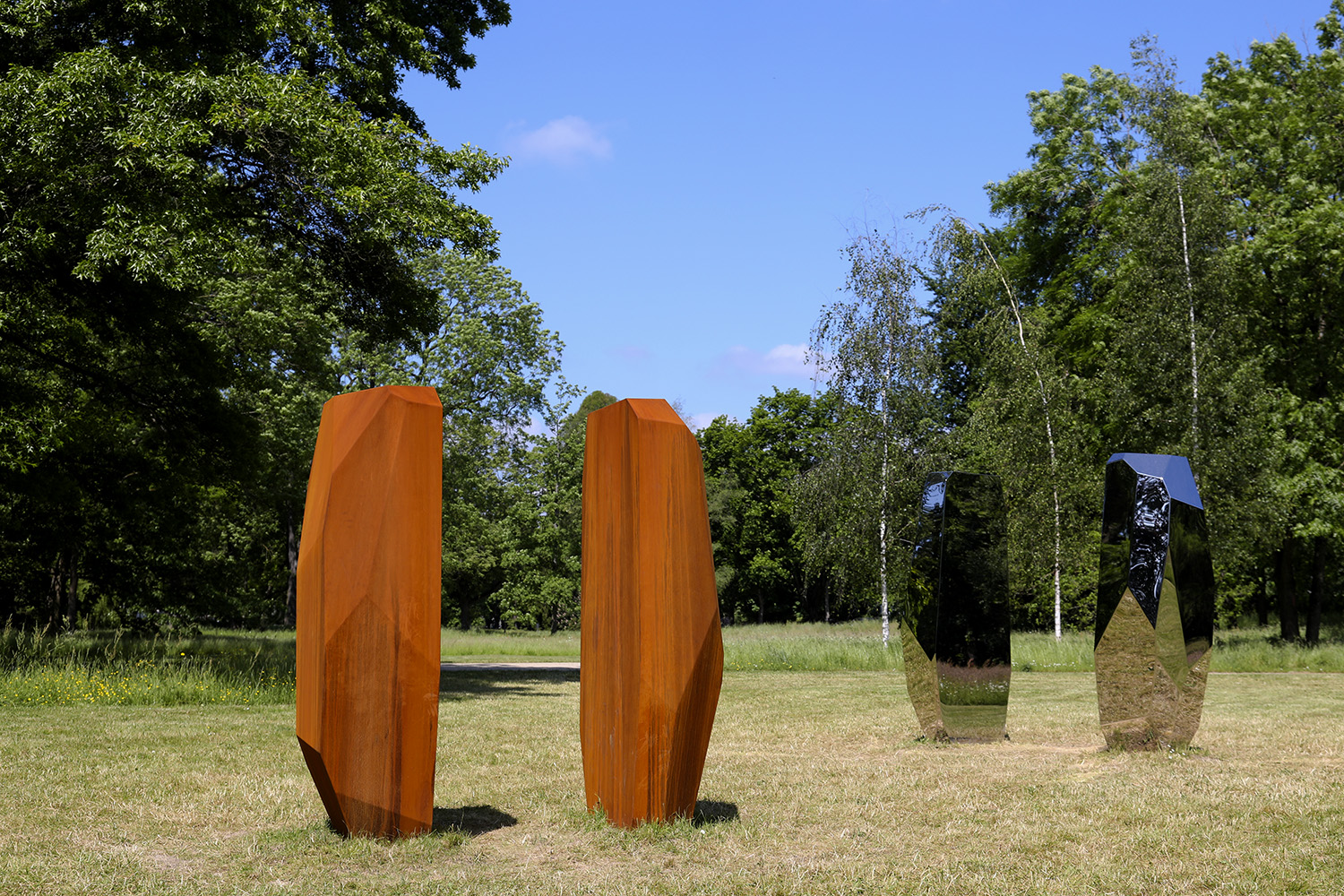 Arik Levys multidisziplinäres Schaffen umfasst neben Skulptur auch Fotografie, Design, Grafik, Bühnenbild und Videokunst. Als Bildhauer ist Levy mit seinen markanten „Rock“-Plastiken im internationalen Kunstbetrieb fest etabliert. Ihren Formenreichtum, die Vielfalt der verwendeten Materialien sowie die Möglichkeiten der Oberfläche entfaltet er in verschiedenen Werkreihen. Dabei ähnelt deren serieller Charakter musikalischen Variationen auf ein Thema, während die Skulpturen im öffentlichen Raum immer zugleich ortsspezifisch und universell erscheinen. Dies gilt auch für die beiden stählernen „RockGates“, die ‚Tore’, die Levy für Blickachsen 13 entworfen hat. In der Grundform gleichen sich beide Skulpturenpaare, wenn auch ihre Maße, die Gestaltung ihrer facettenartigen Oberflächen und die Abstände der beiden Elemente zueinander variieren. Durch die so verschiedenen Stahl-Oberflächen unterscheiden sie sich jedoch drastisch: Einmal reflektiert die spiegelnde Außenhaut die umliegende Natur und die Betrachtenden zwischen den Torsäulen; demgegenüber entwickelt der samtig feine Rost des Corten-Stahls einen geradezu sinnlichen Reiz.