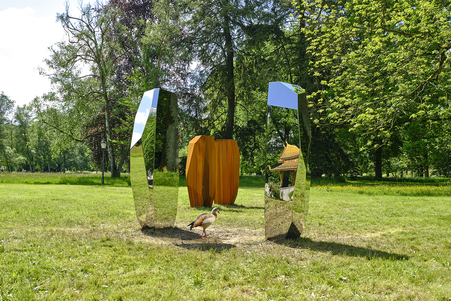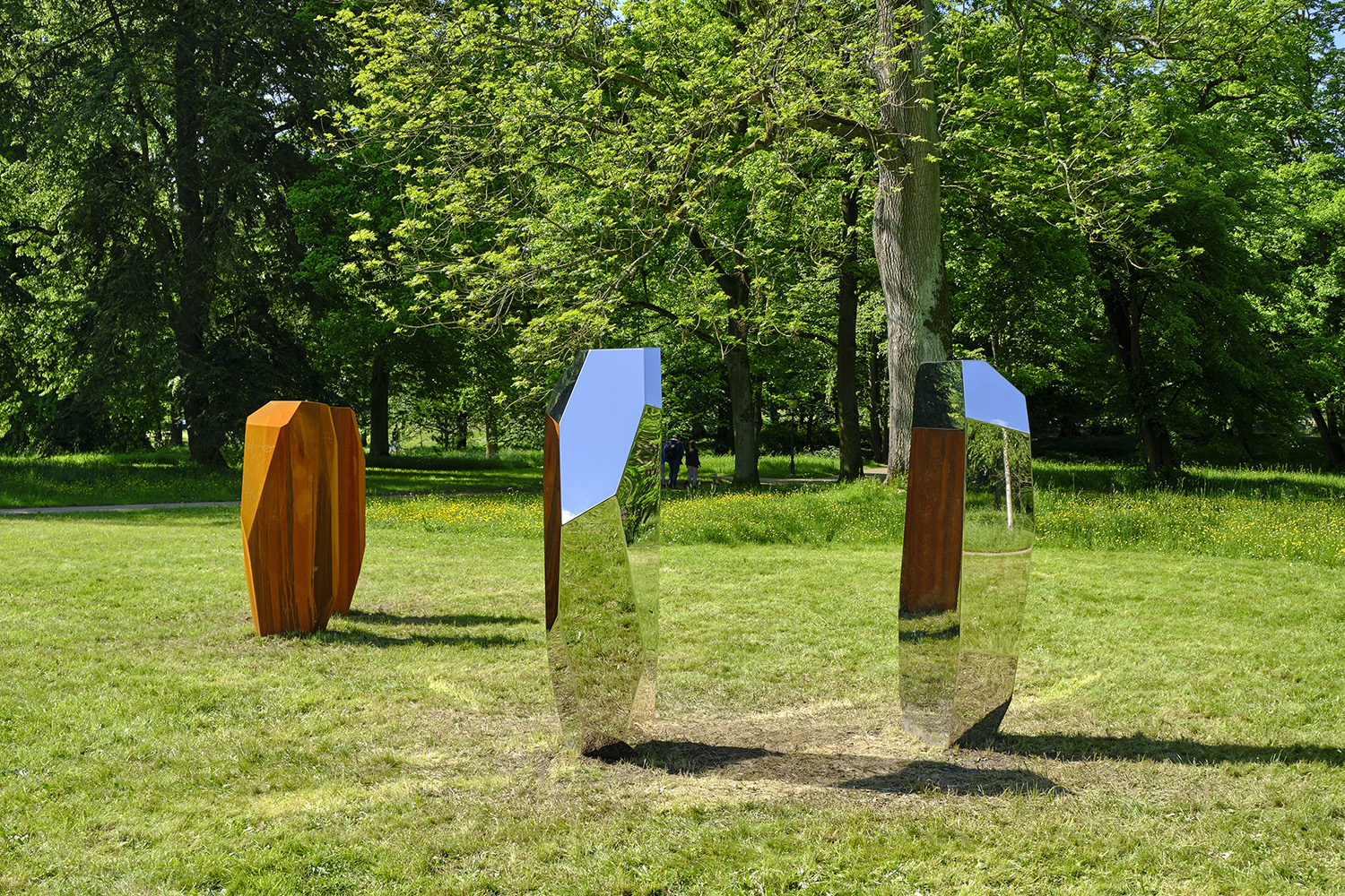 Arik Levys multidisziplinäres Schaffen umfasst neben Skulptur auch Fotografie, Design, Grafik, Bühnenbild und Videokunst. Als Bildhauer ist Levy mit seinen markanten „Rock“-Plastiken im internationalen Kunstbetrieb fest etabliert. Ihren Formenreichtum, die Vielfalt der verwendeten Materialien sowie die Möglichkeiten der Oberfläche entfaltet er in verschiedenen Werkreihen. Dabei ähnelt deren serieller Charakter musikalischen Variationen auf ein Thema, während die Skulpturen im öffentlichen Raum immer zugleich ortsspezifisch und universell erscheinen. Dies gilt auch für die beiden stählernen „RockGates“, die ‚Tore’, die Levy für Blickachsen 13 entworfen hat. In der Grundform gleichen sich beide Skulpturenpaare, wenn auch ihre Maße, die Gestaltung ihrer facettenartigen Oberflächen und die Abstände der beiden Elemente zueinander variieren. Durch die so verschiedenen Stahl-Oberflächen unterscheiden sie sich jedoch drastisch: Einmal reflektiert die spiegelnde Außenhaut die umliegende Natur und die Betrachtenden zwischen den Torsäulen; demgegenüber entwickelt der samtig feine Rost des Corten-Stahls einen geradezu sinnlichen Reiz.