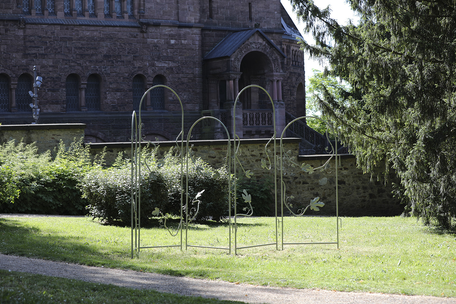 Kasia Fudakowski verbindet im Titel ihres Werks „Climate Changing Room“ durch ein Wortspiel die englischen Begriffe für ‚Klimawandel’ und ‚Umkleidekabine’. Der filigrane Raumteiler aus grün lackierten Stahlbögen bietet – anders als der Titel erwarten lässt – nur minimalen Sichtschutz. Lediglich einige bewegliche Blätter versprechen die Möglichkeit, winzige Körperstellen zu verdecken. Sie spielen auf die metaphorische ebenso wie auf die kunsthistorische Bedeutung des Feigenblatts an. Dieser spielerisch-humorvolle Aspekt steht dabei in scharfem Kontrast zum düsteren Unterton des Verweises auf die globale Erwärmung im Titel. Die fünf Elemente von „Climate Changing Room“ sind Teil der Langzeitarbeit „Continuouslessness“, die auf einem modularen System miteinander verbindbarer Elemente basiert. Sie nimmt eine zentrale Position im künstlerischen Schaffen Fudakowskis ein, das neben Skulptur und Installation auch Wort, Film und Performance umfasst. Auch intellektuelle wie skulpturale Strategien zur Verkehrung verfestigter Normen ins Komische und Absurde sind ein wiederkehrendes Merkmal im Œuvre der Künstlerin.