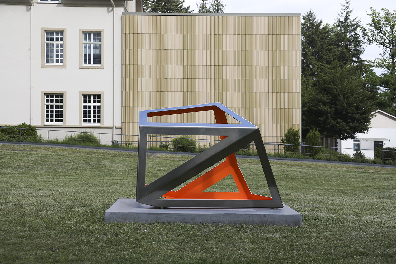 Seit fünfzig Jahren setzt sich Richard Deacon in seinem bildhauerischen Werk auf vielschichtige Weise mit den Charakteristika seiner Materialien auseinander. Der Künstler, der sich selbst als „fabricator“ bezeichnet, schafft skulpturale Konstrukte, die stets dem Wechselspiel von Form und Hohlraum Ausdruck verleihen und dabei offen für das Assoziationsspiel der Betrachtenden sind. Zwei der vier bei Blickachsen 14 präsentierten Arbeiten tragen Titel, die den künstlerischen Prozess beschreiben: Für „Cut & Fold #3“ und „Cut & Fold #5“ schneidet und faltet Deacon Edelstahlplatten und fügt sie zu geometrisch-prismatischen Formen zusammen. Auch die beiden Elemente von „Twofold Way CD (Black)” sind in ähnlichem Vorgehen hergestellt. Die Komponenten von „Infinity #14“, durchbrochen von jeweils zwei oder drei Löchern, lenken den Blick dagegen besonders auf die vielfältigen Möglichkeiten der Oberflächenbearbeitung: In den regelmäßigen Vertiefungen reflektiert gleißend das Sonnenlicht, das durch die schräge Aufstellung direkt auf sie trifft.