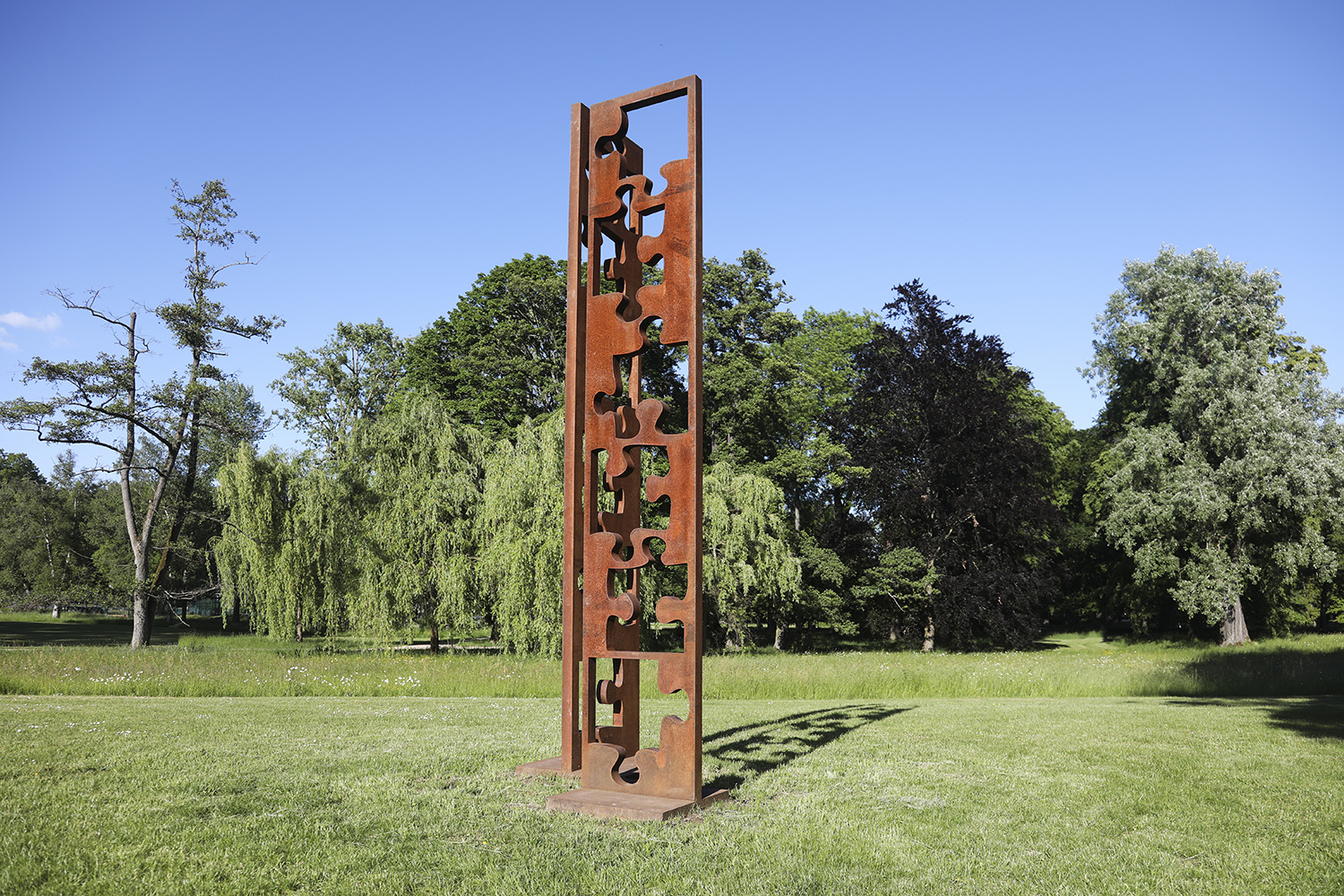Das bevorzugte Material von Georg-Friedrich Wolf ist Stahl. In großformatigen Skulpturen und Werkzyklen setzt er sich unermüdlich mit dessen Eigenschaften auseinander und erweitert stets das Register der Ausdrucksmöglichkeiten, die ihm sein Werkmaterial eröffnet. Bei den Blickachsen 14 zeigt er mit „The Missing Piece“ eine Schlüsselarbeit seines bisherigen Schaffens. Auf einer Rasenfläche im Kurpark liegt ein monumentales Puzzlequadrat aus massiven Stahlplatten – ein Puzzlestück jedoch fehlt. Die leere Stelle im Ordnungssystem, die Lücke ist für Wolf ein „Lebensprinzip”, ein Möglichkeitsraum, in dem wir uns der Welt annähern können: „Die Suche nach dem Missing Piece hält unser Denken in Bewegung.“ Diese Idee greift auch die zweite ausgestellte Arbeit, „Fingerprint VI“, auf. In die über vier Meter hoch aufragenden Stelen sind Leerstellen für Puzzlestücke eingefügt, die beim Umschreiten immer wieder neue Teilansichten der Umgebung freigeben.