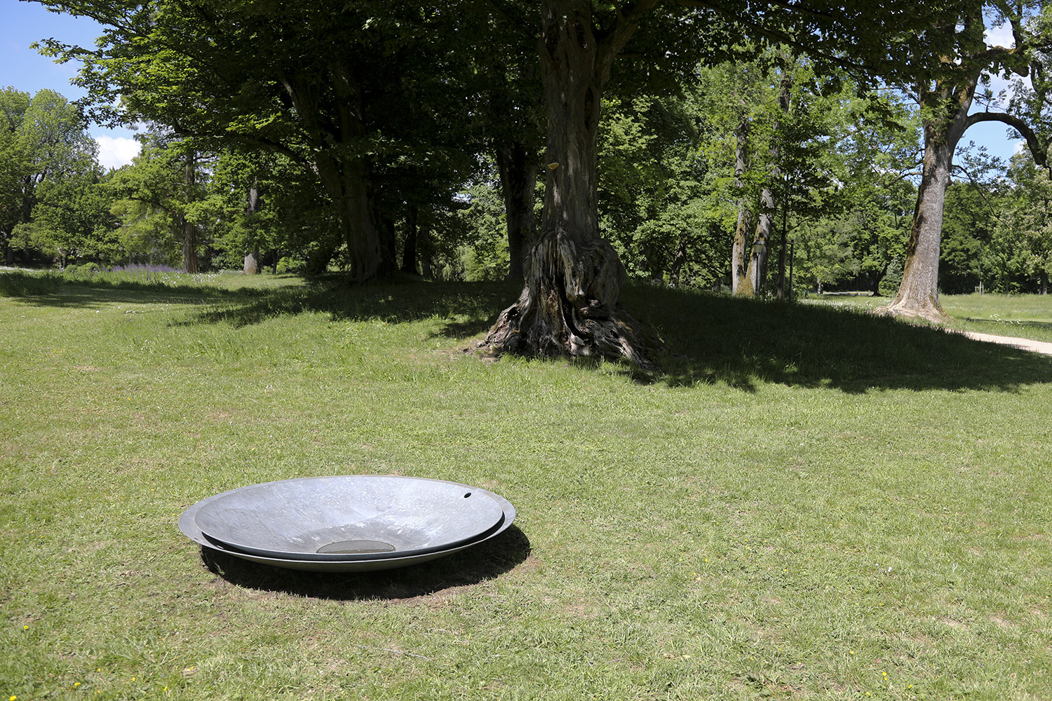 Christiane Möbus’ Werke verbinden konzeptuelle Strenge und ästhetische Prägnanz. Die Künstlerin verwendet in ihren Skulpturen oft gefundene Materialien und Elemente, die untereinander und mit den Werktiteln zusammenwirken, um dichte, poetische Bedeutungen zu weben. Die Wortspiele in den Titeln beziehen sich häufig auf Märchen, geläufige Metaphern oder Redewendungen. Dies ist auch bei „Regen und Traufe“ der Fall – einer Abwandlung der Wendung “vom Regen in die Traufe”, die einen Übergang von einem Übel zu einem noch größeren beschreibt. Die beiden flachen, metallenen Schalen, aus denen die Skulptur besteht, fügen sich zu einem eleganten Gebilde. Dieses füllt sich bei entsprechendem Wetter mit Regenwasser, das durch die kleinen Löcher, die auf beiden Seiten in die Schalen eingelassen sind, langsam abfließt. Der Titel benennt somit zum einen konkret den Vorgang des fließenden Regenwassers, zum anderen läuft er inhaltlich ins Leere und lässt Raum für persönliche Projektionen und Interpretationen der Betrachtenden.