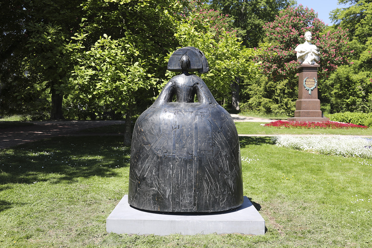 In seinen Skulpturen, Collagen und Grafiken setzt sich Manolo Valdés häufig mit Ikonen der Kunstgeschichte auseinander. Bereits während seiner Zeit in der Künstlergruppe Equipo Crónica kombinierte er die Pop-Art-Strategie der Verwendung weithin bekannter Bilder mit sozialpolitischer Kritik. Später schärft Valdés seinen individuellen Ausdruck. Er greift Details aus berühmten Gemälden auf und lässt einzelne Figuren wie jene aus Diego Velázquez’ „Las meninas“ oder aus dessen Porträt der Königin Mariana von Österreich (1652/53) als Skulpturen in den Raum treten. Der Künstler übersetzt die Vorlage in seine unverwechselbare Bildsprache, indem er die „Reina Mariana“ mal aus Holz oder Stein formt, mal in Kunstharz oder Bronze gießt. Er abstrahiert die Figur, wobei die charakteristische Silhouette mit ausladendem Rock und aufgetürmter Haarpracht stets erkennbar bleibt. Dazu sagt Valdés: „Es ist wie ein Spiel, das darin besteht, den Code und den Schlüssel zum Kunstwerk zu ändern…“.