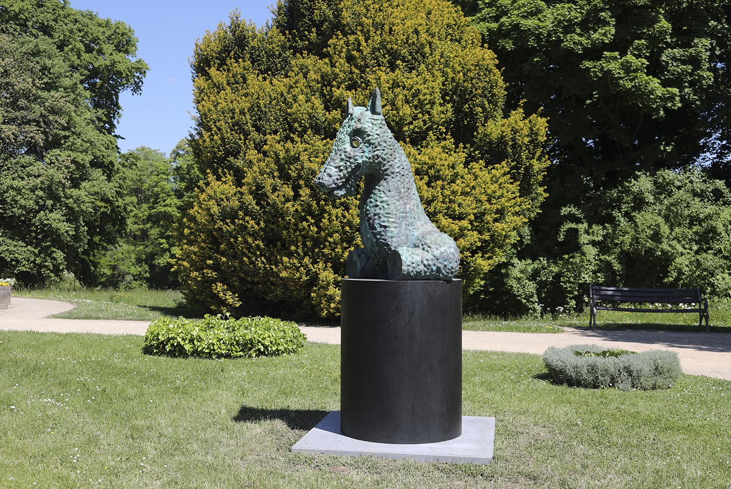 In seinem facettenreichen bildhauerischen Werk gelingt es Thomas Schütte, immer neue Ansätze und Formgebungen hervorzubringen. Ihn beschäftigt die Auseinandersetzung mit Architektur, Geschichte und Erinnerungskultur – so auch in den Werken, die bei den Blickachsen 14 präsentiert werden: Die beiden identischen Skulpturen „Tribute to Moondog“ sind eine Hommage an den exzentrischen Komponisten und Musiker Louis Thomas Hardin (1916-1999), der sich nach seinem Blindenhund „Moondog“ nannte. Die Arbeit durchbricht die Konvention der Gedenkbüste, indem sie nicht die äußere Erscheinung des Porträtierten abbildet, sondern dessen Künstlernamen aufgreift. Die Stahlskulptur „Nuclear Temple“ wird vom Künstler selbst als „Architekturmodell” klassifiziert. Tatsächlich lässt die Größe der Torbögen und der darüber eingelassenen Nischen auf eine mögliche Modellfunktion für einen oktogonalen Kuppelbau schließen. Das Zentrum der drei Meter hohen Skulptur wird durch eine Lichtöffnung am höchsten Punkt der Kuppel erhellt.