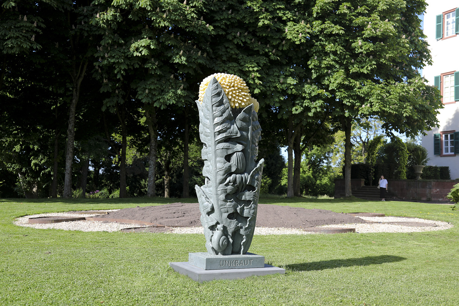 Joscha Bender lotet in seinem Werk die Möglichkeiten der gegenständlichen Skulptur aus – mal verspielt, mal kraftvoll. Seinen oft mehrfarbigen Figuren, die er direkt aus dem Steinblock herausarbeitet, verleiht er dabei eine charmante Leichtigkeit. Im Rahmen der Blickachsen 14 präsentiert Bender im Kurpark einen bronzenen Löwen. Dessen massiver, muskulöser Körper ist geduckt, der Kopf genauso wie die linke vordere Pranke nach vorne gestreckt. Anders als seine Artverwandten auf öffentlichen Monumenten ist Benders „Löwe“ damit nicht in einer repräsentativen Haltung gezeigt, sondern macht sich klein. Es ist unklar, ob er sich an ein Beutetier heranpirscht oder sich heimlich aus seiner angestammten Position wegstiehlt. Umso höher reckt sich dagegen im Schlossgarten der Löwenzahn mit dem Titel „Unkraut vergeht nicht”, den Bender aus blau-grünem Sandstein gehauen und teils leuchtend farbig gefasst hat. Das übergroße, ja beinahe monströse Gewächs scheint seinem Namensverwandten, dem ‚König der Tiere’, den Rang ablaufen zu wollen. Auch der Titel unterstreicht die unerwartete Kraft des wenig Beachteten.