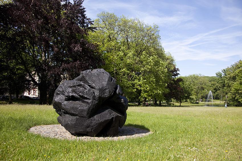 Wie kaum ein anderer Künstler widmet sich David Nash in seinem vielseitigen skulpturalen Werk dem natürlichen Material Holz – und auch seine Bronze- und Eisengüsse entwickelt er aus der Arbeit mit dem Naturmaterial. Weltweit bekannt ist der Brite nicht zuletzt für seine charakteristischen Holzskulpturen mit ganz oder teilweise verkohlter Oberfläche. Bei „Blickachsen 10“ zeigt Nash nun drei schwarz patinierte Bronzearbeiten, deren Holzvorlagen er ebenfalls an der Oberfläche durch kontrolliertes Feuer karbonisiert hat, um ihnen eine „neue visuelle Qualität“ zu verleihen. Selbst aus der Nähe betrachtet wirken sie durch ihre Oberflächenstruktur und Farbe, als handele es sich um verkohltes Holz – man muss sie erst berühren und darauf klopfen, um zu realisieren, dass sie aus Metall sind. Der monumentale „Black Butt“ (Schwarzer Baumstrunk) thematisiert, auch mit seinem Titel, das nur grob zu einer Holzkugel geschnittene Ausgangsmaterial, während die glatt gearbeiteten „Three Humps“ (Drei Höcker) mit je einem aufklaffenden Einschnitt versehen sind und den gestaltenden Eingriff des Künstlers in die Natur offensichtlich machen. Das majestätische Paar „King and Queen“ zeigt auf dem Ferdinandsplatz zwei hoch aufragende abstrakte Figuren, die einander zugewandt eine Einheit bilden.