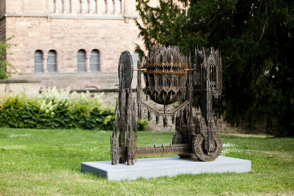 Wim Delvoye erwarb sich international einen Namen mit provozierenden und ironischen Werken wie tätowierten Schweinen, in Bleiglas gefassten Röntgenaufnahmen pornografischen Charakters oder den berühmten Installationen der Serie „Cloaca“, die die Funktionsweise des menschlichen Verdauungsapparates simulieren. In seiner aufwändigen Werkreihe mit dem Titel „Gothic Works“ spielt Delvoye mit den Formen gotischer Kathedralbauten: Mittels ausgefeilter Laserschneidetechnik konstruiert er ornamental durchgestaltete Baustellengeräte und -fahrzeuge aus Corten-Stahl, häufig in Originalgröße, aber auch skulpturale Türme und Kirchen. Er verfremdet die Silhouetten von Betonmischern, Baggern oder Lastwagen mit filigranen Mustern, indem er mit einem Team von Ingenieuren und Computerexperten – den „Handwerkern“ der Gegenwart – auf die architektonischen und dekorativen Merkmale der Gotik zurückgreift und diese nach seinen Vorstellungen abwandelt. Wim Delvoyes „Concrete Mixer“ (Betonmischer), eines der Werke aus dieser Reihe, ist bei „Blickachsen 10“ im Schlosspark vor dem Hintergrund der Bad Homburger Erlöserkirche platziert und führt hier besonders eindrücklich die ihm innewohnenden Gegensätze von Vergangenheit und Gegenwart, Sakralem und Profanem, Ornament und Funktion vor Augen.