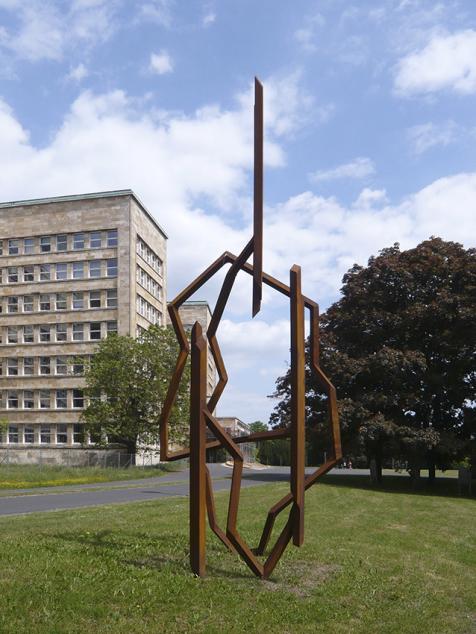 Robert Schad ist bekannt für seine unverwechselbaren Stahlskulpturen im öffentlichen Raum. Ausgehend von der Idee körperlicher Bewegung gestaltet er plastische Linien aus massivem Vierkantstahl, die geradezu tänzerisch den Raum zu erobern scheinen. Bei „Blickachsen 10“ werden vor dem IG-Farben-Haus auf dem Campus Westend der Frankfurter Goethe-Universität neun seiner Außenraumwerke gezeigt. Mit dem Material Stahl werden gemeinhin Eigenschaften wie Schwere, Beständigkeit und Unbeweglichkeit verbunden. Schads dreidimensionale Zeichnungen im Raum jedoch vermitteln den Eindruck von Leichtigkeit und Dynamik. Die trotz ihrer Größe filigran anmutenden Stahllinien recken sich in die Höhe, scheinen sich in der Waagerechten auszubalancieren oder sich mäandernd auf und ab zu bewegen – mal in weiten Schwüngen und Bögen, mal kompakt zusammengedrängt. Die gelenkige Erscheinung der Stahlgebilde steht dabei in starkem Kontrast zur tatsächlichen Massivität des Werkstoffs. „Ich reflektiere mit Stahl in besonderem Maße Wachstum, den Ablauf tänzerischen Ausdrucks“, gibt der Künstler an: „Das Ergebnis im Moment des Betrachtens ins angehaltene Bewegung.“ Die in abstrahierter Form eingefangenen Bewegungsabläufe gilt es in ihrer räumlichen Ausdehnung wahrzunehmen.