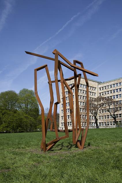 Robert Schad ist bekannt für seine unverwechselbaren Stahlskulpturen im öffentlichen Raum. Ausgehend von der Idee körperlicher Bewegung gestaltet er plastische Linien aus massivem Vierkantstahl, die geradezu tänzerisch den Raum zu erobern scheinen. Bei „Blickachsen 10“ werden vor dem IG-Farben-Haus auf dem Campus Westend der Frankfurter Goethe-Universität neun seiner Außenraumwerke gezeigt. Mit dem Material Stahl werden gemeinhin Eigenschaften wie Schwere, Beständigkeit und Unbeweglichkeit verbunden. Schads dreidimensionale Zeichnungen im Raum jedoch vermitteln den Eindruck von Leichtigkeit und Dynamik. Die trotz ihrer Größe filigran anmutenden Stahllinien recken sich in die Höhe, scheinen sich in der Waagerechten auszubalancieren oder sich mäandernd auf und ab zu bewegen – mal in weiten Schwüngen und Bögen, mal kompakt zusammengedrängt. Die gelenkige Erscheinung der Stahlgebilde steht dabei in starkem Kontrast zur tatsächlichen Massivität des Werkstoffs. „Ich reflektiere mit Stahl in besonderem Maße Wachstum, den Ablauf tänzerischen Ausdrucks“, gibt der Künstler an: „Das Ergebnis im Moment des Betrachtens ins angehaltene Bewegung.“ Die in abstrahierter Form eingefangenen Bewegungsabläufe gilt es in ihrer räumlichen Ausdehnung wahrzunehmen.
