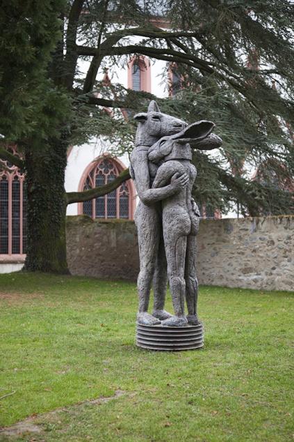 In den Außenbereichen sowie im Armarium des mittelalterlichen Zisterzienserklosters Eberbach sind bei »Blickachsen 10« neun der charakteristischen Werke von Sophie Ryder zu sehen - eine weitere Bronze zeigt die britische Künstlerin im Eschborner Skulpturenpark Niederhöchstadt. Durch ihre sorgfältige Platzierung in der Klosteranlage treten Ryders genauso geheimnisvoll wie vertraut wirkende Figuren und Figurengruppen in einen direkten Dialog mit dem geschichtsträchtigen Ausstellungsort. Tanzend, stehend oder sitzend, als Einzelfigur oder Skulpturenensemble, als Paar mit einem Minotaurus oder umgeben von Hunden - Sophie Ryders »Lady Hare« begegnet dem Besucher auch in den im Kloster Eberbach ausgestellten Bronzen als zentrales Motiv. Als Vorlage für den Frauenkörper dieser Figur dient der Künstlerin der eigene; die Hasenköpfe dagegen – und auch die Tiergestalten - formt sie frei. Es gehe ihr dabei nicht um eine mimetische Wiedergabe, erläutert die Künstlerin: „Ich gestalte Charaktere und Wesen - die Hunde, die Hasen, die Minotauren, sie alle sind Charaktere jenseits der Tierform.“ Neben den Bronzen ist mit der monumentalen „Open Hand“ eine der außergewöhnlichen Arbeiten Sophie Ryders aus galvanisiertem Stahldraht in der Ausstellung zu sehen.