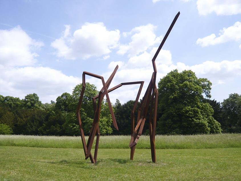 Robert Schad ist bekannt für seine unverwechselbaren Stahlskulpturen im öffentlichen Raum. Ausgehend von der Idee körperlicher Bewegung gestaltet er plastische Linien aus massivem Vierkantstahl, die geradezu tänzerisch den Raum zu erobern scheinen. Bei „Blickachsen 10“ werden vor dem IG-Farben-Haus auf dem Campus Westend der Frankfurter Goethe-Universität neun seiner Außenraumwerke gezeigt. Mit dem Material Stahl werden gemeinhin Eigenschaften wie Schwere, Beständigkeit und Unbeweglichkeit verbunden. Schads dreidimensionale Zeichnungen im Raum jedoch vermitteln den Eindruck von Leichtigkeit und Dynamik. Die trotz ihrer Größe filigran anmutenden Stahllinien recken sich in die Höhe, scheinen sich in der Waagerechten auszubalancieren oder sich mäandernd auf und ab zu bewegen – mal in weiten Schwüngen und Bögen, mal kompakt zusammengedrängt. Die gelenkige Erscheinung der Stahlgebilde steht dabei in starkem Kontrast zur tatsächlichen Massivität des Werkstoffs. „Ich reflektiere mit Stahl in besonderem Maße Wachstum, den Ablauf tänzerischen Ausdrucks“, gibt der Künstler an: „Das Ergebnis im Moment des Betrachtens ins angehaltene Bewegung.“ Die in abstrahierter Form eingefangenen Bewegungsabläufe gilt es in ihrer räumlichen Ausdehnung wahrzunehmen.