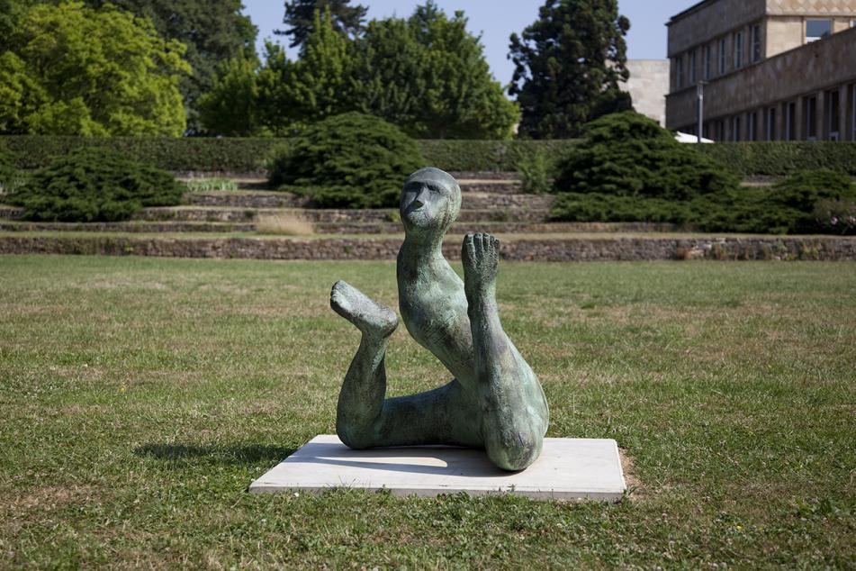 Henk Visch ist Bildhauer, Zeichner und Poet, er kuratiert Ausstellungen und schreibt Kunstkritiken. Figürliche Plastiken zählen ebenso wie abstrakte Konstruktionen zu seinem Œuvre, kleinformatige Werke stehen monumentalen Skulpturen gegenüber und das Material reicht von Holz über Aluminium und Eisen bis hin zu Bronze. Vier der jüngsten Bronzearbeiten des Niederländers aus dem Jahr 2015 sind im Rahmen der Ausstellung „Blickachsen 10“ auf dem Frankfurter Campus Westend zu sehen. Sie zeigen menschliche Figuren, die stehend, sitzend, oder in einer turnenden Haltung mit nach unten gebeugtem Kopf und hochgerecktem Gesäß wiedergegeben sind. Ihre Körper sind verdreht, ihre Köpfe im Verhältnis zum Körper zu groß oder zu klein geraten und einzelne Gliedmaßen fehlen ganz. Durch ihre Haltung und Gestik vermitteln die Figuren den Eindruck einer Suche nach innerer und äußerer Balance. Doch Henk Vischs Skulpturen entziehen sich einer eindeutigen Interpretation: Sie sind als „Angebote grenzenloser Denkräume“ zu verstehen. Der Betrachter ist dazu angehalten, sich selbst zu den Werken in Beziehung setzen, sich ihnen in einer »kindlichen«, im Sinne einer offenen Haltung zu nähern. Die rätselhaften Titel der Arbeiten dienen dabei lediglich als Assoziationsanregung.