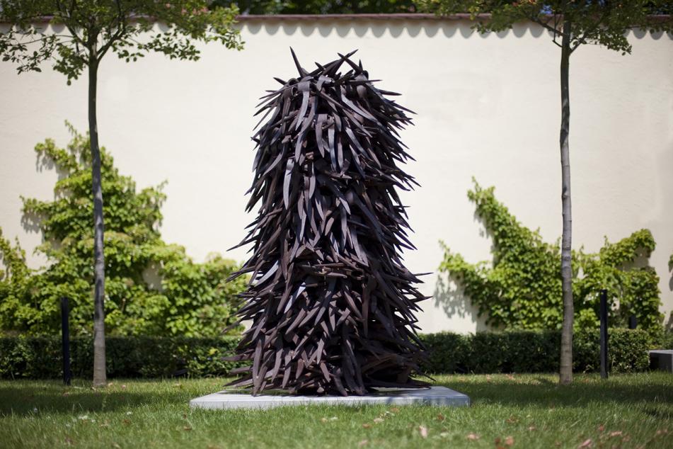 Arman (geb. Armand Pierre Fernandez), einer der Hauptvertreter des Nouveau Réalisme, ist bei „Blickachsen 10“ mit zwei Arbeiten in Bad Homburg und einer weiteren Skulptur in Kronberg vertreten. Die im Bad HomburgerKurpark platzierte Figur „Sic transit gloria mundi“ entstammt der Serie „Atlantis“, deren Bronzewerke – mit einer dichten, opaken Patina überzogen – an archäologische Artefakte erinnern, die lange im Meer versunken lagen. Dass Arman den Revolutionär Lenin zum Gegenstand dieser Werkserie macht und die Skulptur mit dem Zitat »So vergeht der Ruhm der Welt« betitelt, mag als politisches Statement gelten. Auf jeden Fall eröffnet die Platzierung gegenüber dem Kaiser-Wilhelms-Denkmal einen spannenden Dialog zwischen Kunst und Geschichte: Kaiser Wilhelm II., Enkel des dargestellten Kaisers Wilhelm I., ermöglichte Lenin 1917 seine Rückkehr aus dem Schweizer Exil nach Russland und unterstützte die Bolschewiki finanziell. Im Hof des Museums Sinclair-Haus ist die Akkumulation „Tous azimuts“ zu sehen. Sie besteht aus unzähligen, zu einem säulenartigen Gebilde zusammengefügten Spitzhacken, deren Spitzen „nach allen Seiten“ (so der Titel) in den Raum ausgreifen. Es sind Relikte des Arbeitsalltags, die Arman durch künstlerische Anordnung ästhetisch überformt.