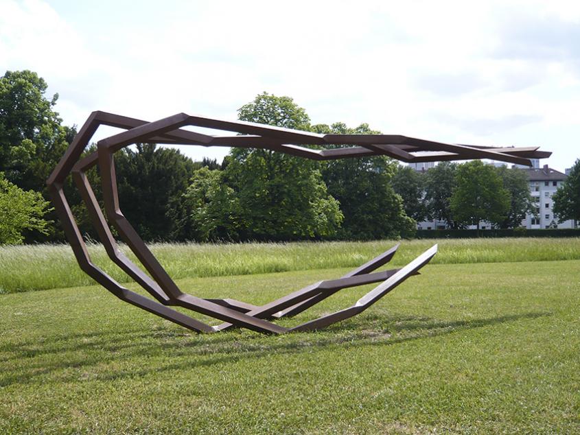 Robert Schad ist bekannt für seine unverwechselbaren Stahlskulpturen im öffentlichen Raum. Ausgehend von der Idee körperlicher Bewegung gestaltet er plastische Linien aus massivem Vierkantstahl, die geradezu tänzerisch den Raum zu erobern scheinen. Bei „Blickachsen 10“ werden vor dem IG-Farben-Haus auf dem Campus Westend der Frankfurter Goethe-Universität neun seiner Außenraumwerke gezeigt. Mit dem Material Stahl werden gemeinhin Eigenschaften wie Schwere, Beständigkeit und Unbeweglichkeit verbunden. Schads dreidimensionale Zeichnungen im Raum jedoch vermitteln den Eindruck von Leichtigkeit und Dynamik. Die trotz ihrer Größe filigran anmutenden Stahllinien recken sich in die Höhe, scheinen sich in der Waagerechten auszubalancieren oder sich mäandernd auf und ab zu bewegen – mal in weiten Schwüngen und Bögen, mal kompakt zusammengedrängt. Die gelenkige Erscheinung der Stahlgebilde steht dabei in starkem Kontrast zur tatsächlichen Massivität des Werkstoffs. „Ich reflektiere mit Stahl in besonderem Maße Wachstum, den Ablauf tänzerischen Ausdrucks“, gibt der Künstler an: „Das Ergebnis im Moment des Betrachtens ins angehaltene Bewegung.“ Die in abstrahierter Form eingefangenen Bewegungsabläufe gilt es in ihrer räumlichen Ausdehnung wahrzunehmen.