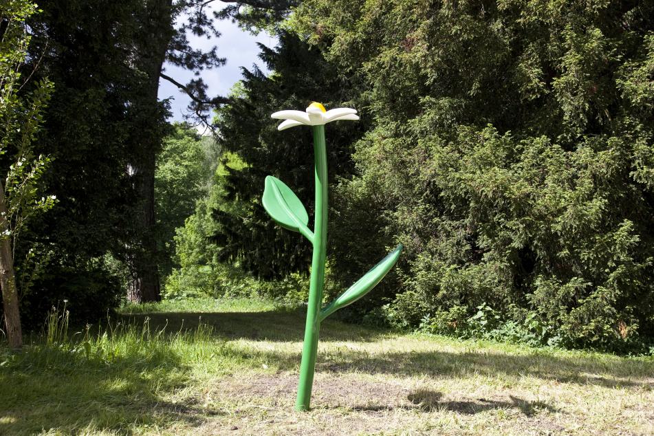 Hoch und weithin sichtbar streckt sich Thomas Stimms grellbunte, stark vergrößerte weißblühende „Blume“ hinauf. Abhängig von der Umgebung, sei es nun eine Wiese oder ein betonierter Stadtraum, überragt sie entweder ihre ‚echten‘ kleineren Artgenossen oder steht kontrastiv zum urbanen Leben. Die „Blume“ aus lackiertem Aluminium steht charakteristisch für das Werk des österreichischen Bildhauers, der sich seit den 1980er-Jahren mit Naturstücken, Pflanzen- und Wasserwelten sowie mit individuellen Blumenfiguren befasst und diese in sowohl proportional als auch farblich verfremdeter Form im Innen- und Außenraum platziert. Die reduzierte minimale Formensprache unterstreicht die unausweichliche Erfahrbarkeit der Pflanzenwelt. Dabei schließt der Künstler die metaphorische Bedeutung seiner Blumen kategorisch aus: Sie stehen nicht für etwas anderes, sondern stets für sich und sollen in dieser in sich selbst ruhenden Relevanz nachdrücklich und unübersehbar präsentiert werden. Stimm setzte sich nach seinem Studium an der Akademie der Bildenden Künste in Wien auf verschiedene Weise mit ‚Größe‘ auseinander. So fertigte er etwa Miniaturwelten oder großformatige Keramiken, die mitunter durch digitale Techniken in Kunststoff oder Aluminium übertragen wurden.