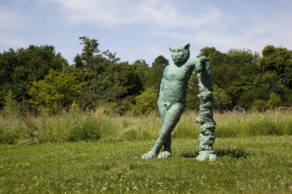 Eine der eigenständigsten zeitgenössischen Bildhauerinnen Englands, Laura Ford, war bereits mehrfach in den „Blickachsen“ vertreten. Dieses Jahr bespielen ihre doppeldeutigen Plastiken, die an Figuren aus Kinderbüchern erinnern, den Skulpturenpark Niederhöchstadt in Eschborn. Ihre märchenhaft anmutenden Mischwesen oder verfremdeten Tier- und Menschenfiguren wirken auf den ersten Blick verspielt und doch verbirgt sich oftmals ein ernster oder auch melancholischer Zug unter dieser vermeintlichen Nahbarkeit der Figuren. So sinniert der überlebensgroße Kater „Leaning Behemoth“, der einer Figur aus Michail Bulgakovs Roman „Der Meister und Margarita“ entlehnt ist, über die trostlose Realität des Seins. Die Gruppe der „Dancing Clog Girls“ wurde ursprünglich für das Augsburger Schaetzlerpalais entworfen und bezieht sich historisch auf einen Besuch von Marie Antoinette, zu deren Ehren die Patrizierdamen tanzten. Das eigentlich heitere Motiv des Tanzes wird kontrastiert von den dunkel gehaltenen Figuren ohne Gesicht, deren hagere Körper fest in die weit ausladenden, schwingenden Röcke geschnürt sind. Die Gruppe der Affen präsentiert ihre Verletzlichkeit über verschiedentlich bandagierte Körperteile und ruft in ihrer Nähe zum Menschen auch dessen eigene Fragilität auf.