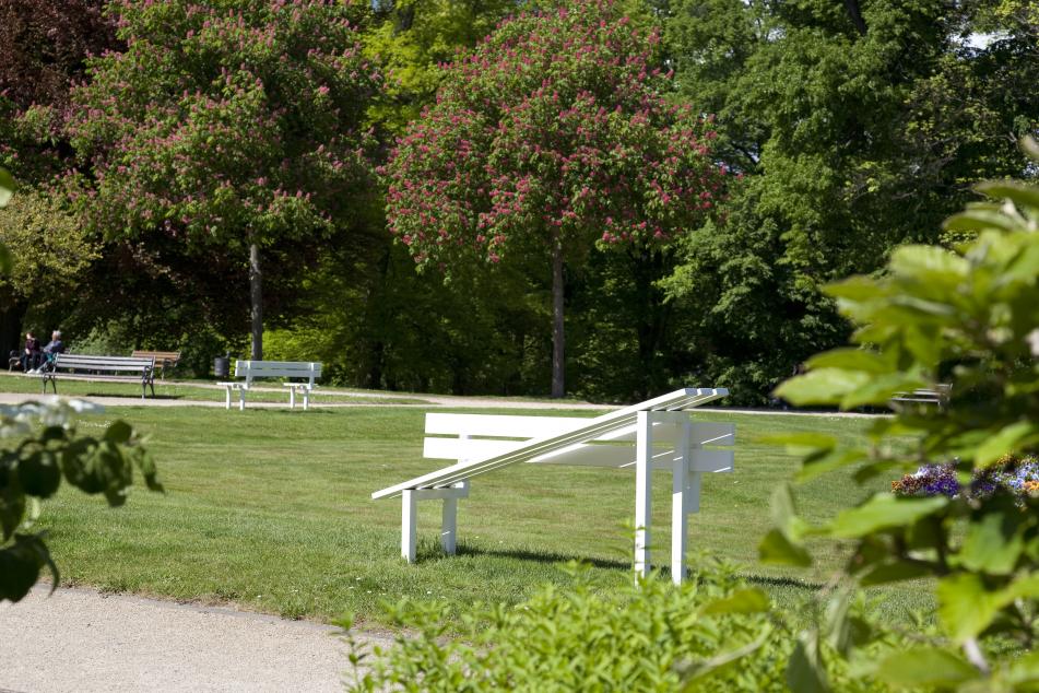 Jeppe Hein, Absolvent der Königlich Dänischen Kunstakademie und der Städelschule in Frankfurt, lebt heute in Berlin sowie Kopenhagen und ist international mit seinen interaktiven Kunstobjekten vertreten. Gleich dreimal bietet eine „Modified Social Bench“ (modifizierte Gemeinschafts-Bank) den Besuchern der „Blickachsen 11“ auf dem Schmuckplatz des Bad Homburger Kurparks die Möglichkeit, eine der von Jeppe Hein humorvoll gestalteten Sitzgelegenheiten zu nutzen. Hein interpretiert die klassische Parkbank in dieser Werkserie ganz neu und fordert die Bewohner und Gäste der Stadt heraus, sich der Variation zu stellen: Seine seit 2005 vielerorts im öffentlichen Raum aufgestellten Bänke dienen nicht nur zum Sitzen, sondern ermöglichen oder verlangen je nach Ausführung, sich einander zuzuwenden, Halt auf den ungewohnten Stadtmöbeln zu finden oder sie sich spielerisch anzueignen. Hein entwirft wiederholt Skulpturen für den Außenraum, die diesen nicht nur gestalten oder schmücken sollen. Vielmehr können seine Werke als Aufruf gelten, die Umgebung aktiv zu nutzen, in ihr zu verweilen oder sie aus anderer Perspektive zu betrachten. So erschafft Hein stets Orte der Begegnung, des Gesprächs, des Spiels, Orte, die allen Menschen gleichermaßen offenstehen und miteinander geteilt werden sollen.