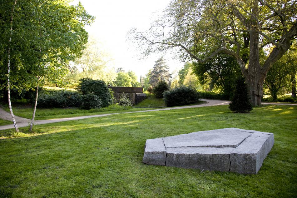 Ulrich Rückriem, der bereits bei „Blickachsen 3“ dabei war, ist einer der auch international schon lange bekannten deutschen Bildhauer der Gegenwart. Seit den 1960er-Jahren nimmt er an renommierten Ausstellungen im In- und Ausland teil und ist in zahlreichen Museen und im öffentlichen Raum präsent. Der gelernte Steinmetz fertigt seit Ende der 1960er-Jahre seine konzeptuell ausgerichteten charakteristischen Steinskulpturen an. Dabei zerteilt er v.a. großformatige quaderförmige Steinblöcke und setzt sie anschließend wieder zusammen. Die Bearbeitungsspuren, die Schnitte oder Spalten bleiben sichtbar belassen, wodurch weniger eine darstellende Erzählung in den Fokus der Betrachtung gerückt wird als die Ästhetik des Materials und dessen Bearbeitung. Die aus finnischem Granit gefertigte Arbeit ohne Titel (1991) bei „Blickachsen 11“ besteht aus einer oktogonalen Form und betont darin die künstlerische Bearbeitung des Steins. Flächig auf dem Boden aufgebracht, schiebt sich eine ebenfalls oktogonale Ebene aus den Umrissen der Gesamtplatte heraus und bleibt leicht angeschrägt nach oben stehen. Die Ausrichtung der aufsteigenden Platte vermittelt eine klarere Betrachterposition, während die markant herausgearbeitete Form die besondere Ästhetik von Stein in seiner massiven Gewichtigkeit unterstreicht.