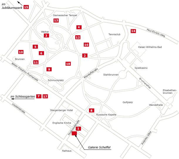 Bitte klicken Sie im Lageplan auf die Zahlen oder weiter unten auf die Werktitel, um Abbildungen der einzelnen Kunstwerke und Angaben zu ihnen aufzurufen.