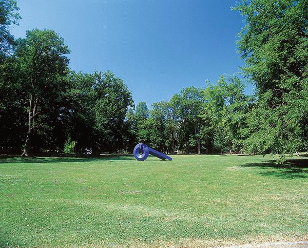 Der mexikanische Bildhauer Sebastian - mit bürgerlichem Namen Enrique Carbajal - ist international bekannt durch seine monumentalen, farbig gefaßten Stahlplastiken im urbanen Umfeld. Das Gefühl für die Dimension hat er sich bei seinem Freund und Lehrer Mathias Goeritz angeeignet, bei dem er Jahre gearbeitet hat. Sebastian entwickelt seine riesigen Stahlarbeiten aus aufklappbaren und variablen Papp- oder Holzkonstruktionen. Aufge-baut aus komplizierten kristallinen Einzelformen bilden diese mit all ihren variablen Möglichkeiten eine äußerst heterogene Formenvielfalt. Die harmonisch ineinander übergehenden stereometrischen Körper seiner Großplastiken werden durch die monochrome, meist rote oder blaue Bemalung vereinheitlicht, ja, zum Teil sogar unkenntlich. Auf diese Weise entsteht aus der Komplexität seiner Formen die Einheitlichkeit der Gesamtplastik. Die in dunklem Blau gefaßte Arbeit „Anillo" von 1998 (Plan Nr. 13) ist gegen die mitunter bis 50 m hohen sonstigen Plastiken des Mexikaners vergleichsweise klein, stellt aber ein gutes Beispiel seiner Arbeitsweise dar. Auch dieses Werk mit den unterschiedlichen Durchblicken und Ansichten beherrscht den Raum um sich und bildet einen formalen wie farbigen Anziehungspunkt, der trotz der dominierenden konstruktiven Struktur sich wohltuend einfügt in die Natur des Kurparks.