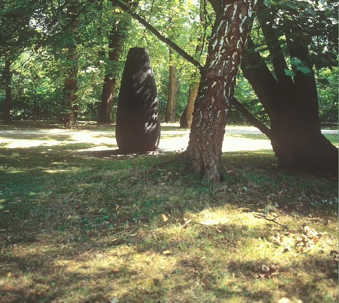 David Nashs große Holzarbeiten bilden zu den in Farbe gefaßten Stahlkonstruktionen von Sebastian und di Suvero den eindeutigen Gegenpol. Im Kurpark stehen zwei Skulpturen von ihm nicht weit auseinander: „Black Cross" von 1994 und „Folding Egg" von 1999 (Plan Nr. 5 und 6). „Black Cross", die 260 cm hohe, wuchtige, halb verkohlte Plastik aus Eichenholz steht unter einem sich vielästig verzweigenden Baum, der unmittelbar Beziehung zu dem Kunstwerk aufnimmt. Zeigt das untere Drittel des gespaltenen Eichenstamms die helle und warme Holzfarbe, so beginnt aufwärts die durch Verbrennen verursachte Verkohlung des Stammes. Die hellbraune, faserige Struktur des Holzes - die Arbeitsspuren der Spaltung und Risse im Holz vermitteln einen handwerklichen, natürlichen Adel - steht im krassen Gegensatz zur porenhaften Verkohlung: Versengt, schwarz, von einer mineralischen, zellenartigen Struktur kleinteilig überzogen. Mitten in den oberen Teil der Schauseite ist ein großes, gleichschenkeliges Kreuz eingeschnitten, dessen ebenfalls verkohltes Inneres durch Schatten noch schwärzer wirkt. So tritt es besonders hervor und wirkt gegen die schwarze, aber durch Licht modullierte Fläche des Stammes monochrom und einheitlich: Das Kreuz als Symbol des Leidens und der Hoffnung? Paul Nash, dem Baum und dem Holz inniglich verbunden, weiß genau um die zwei Seiten der menschlichen Reaktion auf Verkohlungen: „Rudolf Steiner", so äußert er sich, „sprach im Zusammenhang mit Kohle von zwei menschlichen Reaktionen: Das Fühlen und das Denken. Der fühlende Instinkt - zusammen mit der Seele - wird abgewiesen, zieht sich zurück, während der denkende Instinkt - zusammen mit dem Geist - erregt und fortschreitet. Diese beiden gleichzeitigen Erfahrungen gehören zusammen." So fallen Zerstörung und Fortschritt im Erlebnis der Verkohlung zusammen: Natur als bleibende Quelle für die Entwicklung des Menschen.