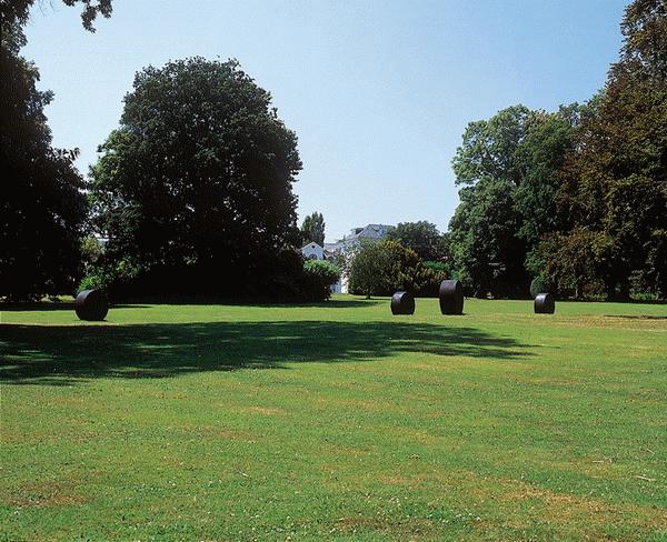 Michael Zwingmann hat seine Raum greifende Arbeit „Invasion" genannt (Plan Nr. 18). Fünf schwarze, große Räder sind auf einer frei liegenden, leicht abschüssigen Rasenfläche in anscheinend zufälliger Weise verteilt, aber in gleicher Richtung ausgerichtet. Das Material der im Durchmesser 185 cm messenden und 80 cm dicken Rollen ist Gußasphalt. Die Mittelachsen sind aus hohlen, durchschaubaren Rohren gebildet. Asphalt, eine schwarze Masse, wird von Zwingmann bis 250° C erhitzt und in vorher konstruierte Metallformen gegossen und abgekühlt: Das Material wird fest. Asphalt ist das klassische Material des Straßenbaus, in dem es bekanntlich als Straßenbelag eingesetzt wird.