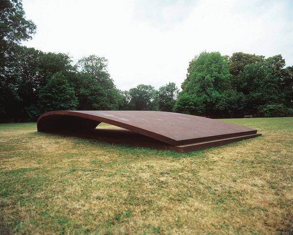 Alf Lechners 44 Tonnen schwere Plastik „Stahlblatt Nr. 6" von 1986/ 90 (Plan Nr. 4) liegt mit ihrer 10 cm dicken, planen Bodenplatte von 926 cm Länge und 360 cm Breite auf einer großen Rasenfläche. Im Hintergrund erhebt sich der Siamesische Tempel und in der weiteren Umgebung wird die Arbeit von großen Bäumen umrahmt. Auf dieser rechteckigen Bodenplatte wölbt sich 96 cm hoch eine ebenso mächtige Stahlbramme, die jedoch nicht nur nach oben hin gewölbt, sondern im gleichen Radius von 1750 cm auch seitwärts gebogen scheint; wobei die seitlichen Bögen bei der Herstellung der Bramme aus dem ursprünglich noch größeren Stahlblech mit jeweils diesem Radius ausgeschnitten wurden. Die so entstandene Plastik lebt von ihrer Materialität ebenso wie von der optischen Gegensätzlichkeit der beiden Stahlbrammen: Hier die schwer lastende, klare rechteckige Form der Bodenplatte, darüber die sich wölbende und zur Seite hin herausgeschobene obere Platte, die trotz des Wissens um ihre respektable Materialität leicht, ja schwebend wirkt.