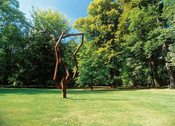 Robert Schads Stahlskulptur „Tauk" von 1998 (Plan Nr. 11) zeigt im Gegensatz zu den Arbeiten Prantls und Nashs nicht die einfühlsame Gesamtintegration in die Natur. Er nähert sich ihr von einer anderen Seite: Die robuste, aus dem Boden wachsende zeichnerische Linie aus massivem, 10 cm dickem Vierkantstahl umreißt chiffrenhaft und in abrupten Bewegungsschüben den Raum. „In der figurativen Aura einer schwebend leichten Choreographie sind seine Arbeiten erstaunlich leichte Gesten in einem schweren Material," meint Andrea Gleiniger. Bewegung und Entmaterialisierung sind gleichbleibende Charakteristika der Schadschen Plastiken. „Tauk" umschreibt in zackig bewegten Linien die vorsichtig angedeuteten Umrisse eines Baumes, der vom Wind bewegt und von Luft durchströmt wird. Die choreographischen Bewegungsschübe der plastischen Linie bewirken das sinnliche Fühlen der Bewegung der Blätter und Äste. So gewinnt Schad dem massiven und schweren Stahlmaterial, Inbegriff des Ingenieurzeitalters, die „Leichtigkeit des Seins" ab und gliedert es wieder ein in seine naturhafte Herkunft. Aus diesem Grund wirkt die aufragende, 445 cm hohe Plastik nicht als kontrastierender Fremdkörper in der Parklandschaft, sondern wie ein zwar von Menschenhand gestalteter, aber der Natur angepaßter Körper, ganz im Sinne der Arpschen Auffassung von Plastik. Schad gelingt ein Dialog mit dem Raum und der ihn durchwirkenden Natur, in die seine Plastik durch die obere auslaufende Stahlspitze verweist und übergeht.