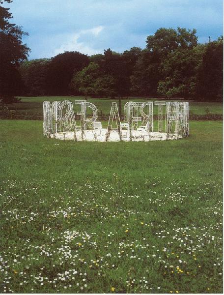 Aktivierende Buchstabenbilder schufen bereits Paul Klee und Max Ernst, Farbrizio Plessi oder Ludger Gerdes. Zeichen und Raum, Botschaft und Aktivierungsimpuls fallen zusammen. Ebenso bedeutsam wie der Geist der Buchstaben ist bei Calero die kreisförmige, weltumspannende Anlage und das Zitat der Pappel. Diese erinnert an jene Pappelinsel von Ermenonville bei Paris, wo das Grabmal (von 1778) des berühmten französischen Aufklärers Jean-Jacques Rousseau schon im 18. Jh. zu einem Wallfahrtsort wurde. Bis zur Überführung der Gebeine des Philosophen ins Pariser Pantheon (1794) war die Pappelinsel ein echtes Grabmal inmitten des Landschaftsgartens. Der Sarkophag trägt die Aufschrift: „Hier ruht der Mann der Natur und der Wahrheit". Um eben diese Begriffe geht es auch Calero in seiner „Insel" des Dialoges.