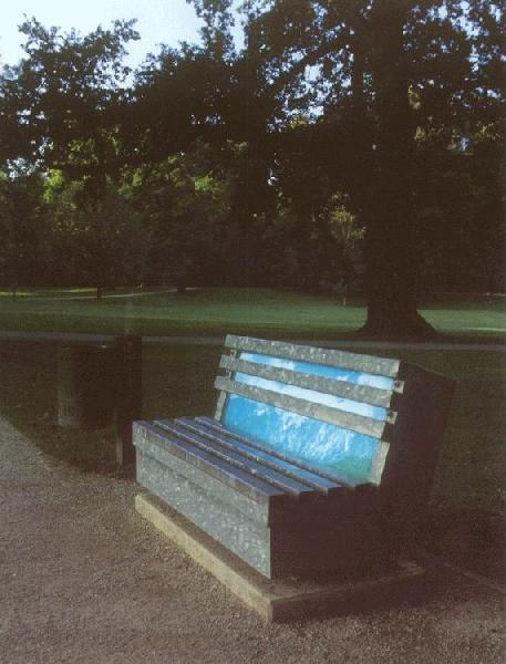 „Memory" lautet der hintersinnige Titel der Ruhebank, Gedenken an den Sinn des Lebens und an die Utopie ferngerückter, durch Rohre vergitterter Hoffnungen auf Erlösung und Licht.