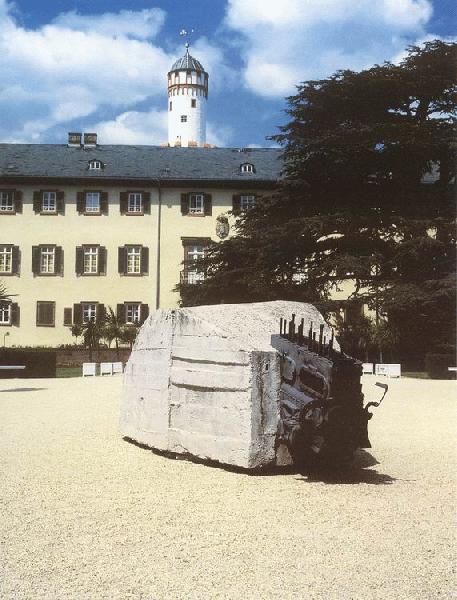 Da Vostell nicht „einfach erschrecken, sondern aufrütteln" will, werden die Mittel, in der Regel Stahl und Beton, entsprechend direkt, ja brutal eingesetzt. 1986/87 entstanden „2 BetonCadillacs in Form der nackten Maja", in denen Auto- und Betonteile die Konfrontation aufnehmen. Zerquetschte und einbetonierte Karosserien – von dem sargähnlich betonierten Opel Kapitän (Köln 1969) bis zum Beton-Cadillac-Denkmal auf dem Berliner Rathenau-Platz – erheben mit ihrer buchstäblich innewohnenden Agressivität den Anspruch, daß Kunst bis hin zur Zerstörung revolutionär sein muß. Vostell deutet seine Objekte antropomorph (als Maja-Frau) und gibt ihnen, wie es gleichfalls Andy Warhol in seinen „Crashs" vorführt, die Aura des Todes. Das sei, so Vostell rückblickend, „die neue Kunst nach Picasso, die nicht mehr nur mit dem Pinsel gemacht wird". Während Picassos Stier noch das Leiden der Menschheit in sich sammelt, verkörpert Vostells hier vorgestellter Beton- „Stier", in dessen Leib ein Motorteil eingerammt ist, die nackte Gewalt. Doch nur ein solches Maschinen-Tier in der Gestalt eines Monstrums ist andererseits imstande, in die Rolle jener grimmigen Dämone zu schlüpfen, die den kostbaren „Garten der Hesperiden" bewachen. Eben diese Rolle ist dem „Stier" vor dem Schloß in Bad Homburg zugefallen.